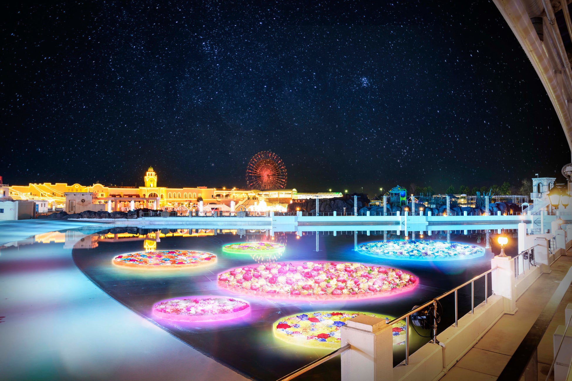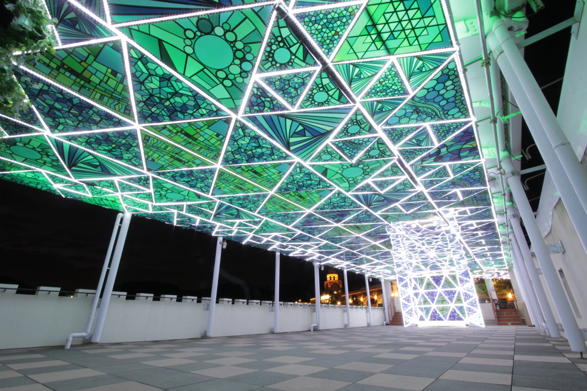 ラグナシア全体を見渡すことが出来るテラスの天井には、まるでステンドグラスのようなイルミネーションが広がり、やわらかい光が降り注ぎます。