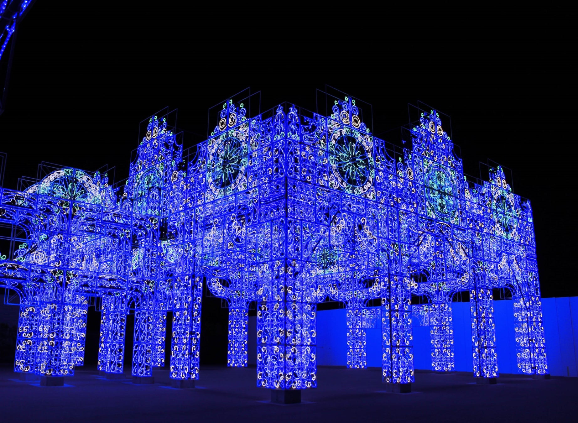 美しいマリンブルー一色の宮殿イルミネーションです。青く輝く宮殿の中を歩けば、壮大な青の世界が広がります。
