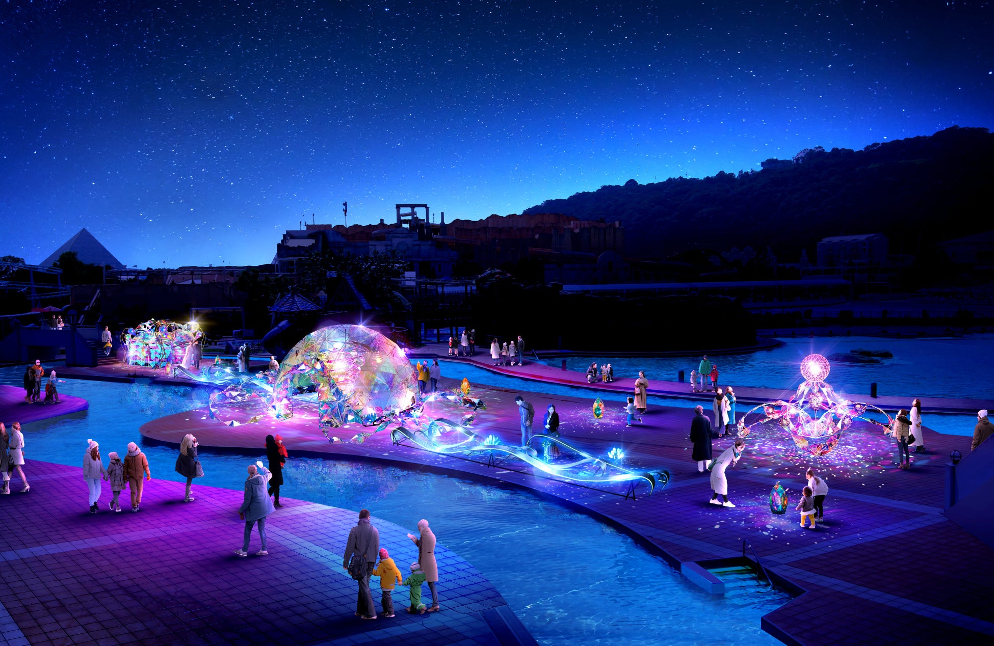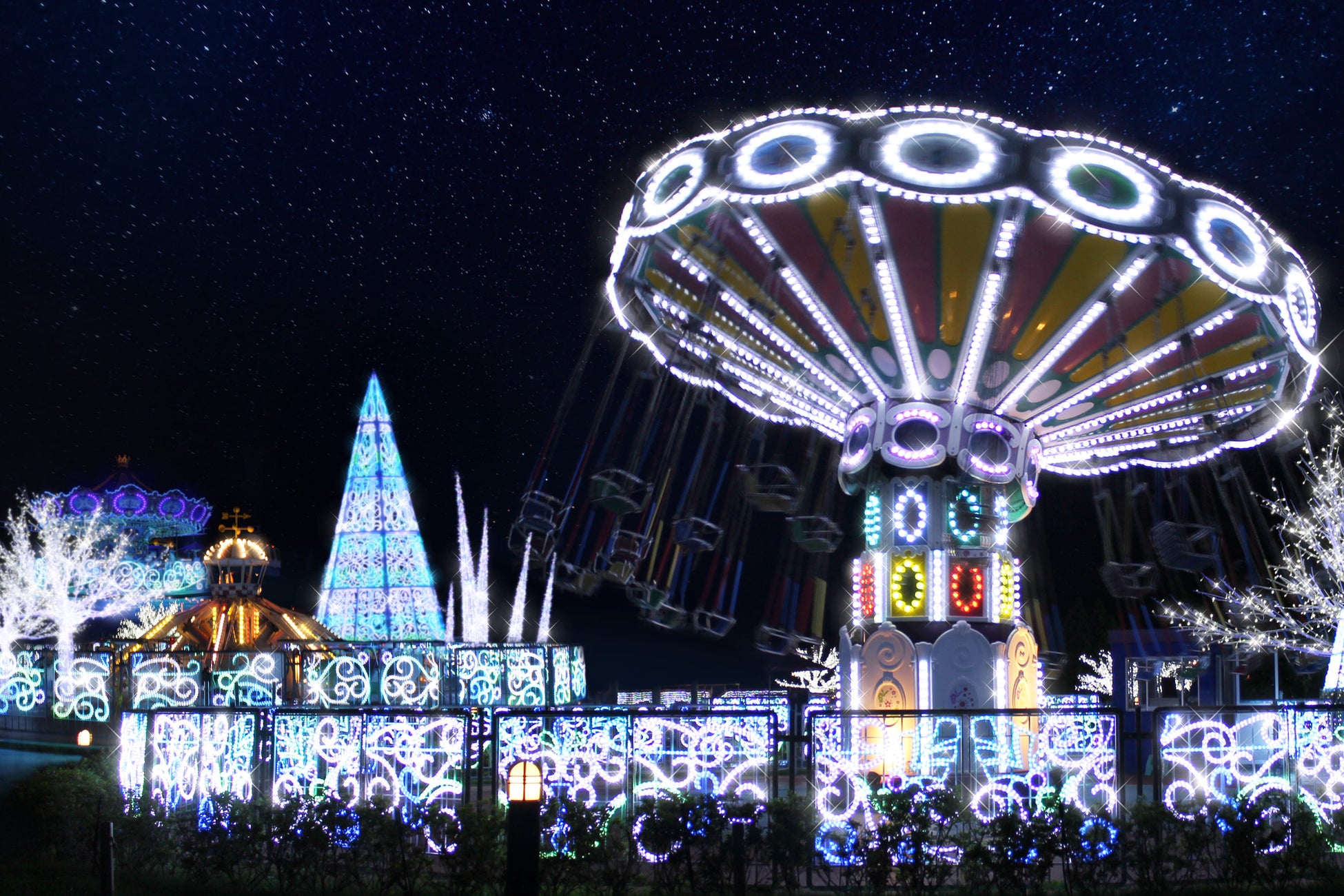お子さま向けのアトラクションエリア「ステラパーク」もファンタジー溢れる世界に。キラキラと輝くイルミネーションに包まれながらアトラクションを楽しめます。