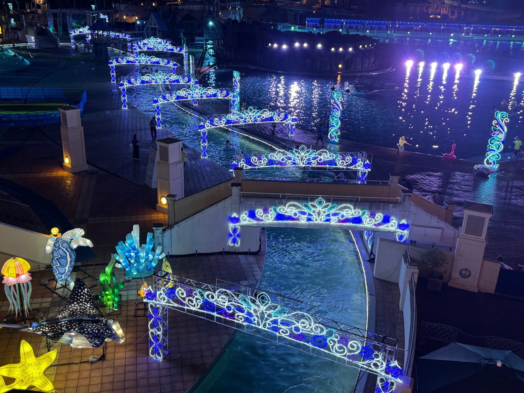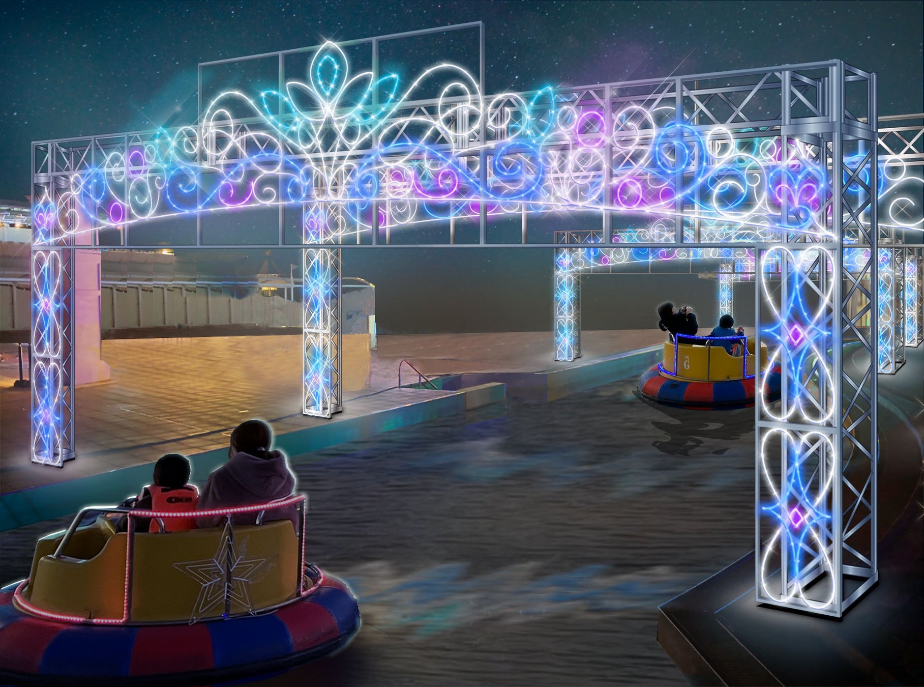 今年のナイトプールから登場した新イルミネーションです。ウォーターアクティビティ「バンパーボート」でクリスタルアーチの中を通ることができます。