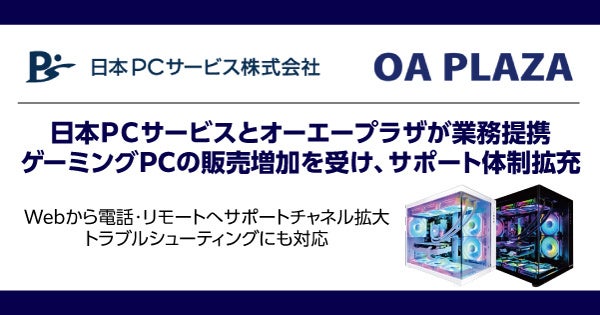 デジタル機器の設定・トラブル解決を行う日本PCサービス株式会社(本社:大阪府吹田市、代表取締役社長:家喜 信行、証券コード:6025、以下「当社」)は、パソコン及び周辺機器販売を行う株式会社オーエープラザ(本社:埼玉県八潮市、代表取締役社長:王 含宗、以下「オーエープラザ」)と業務提携し、オーエープラザが運営するPCショップサイト「PASOUL」を利用しているユーザーへのサポートを5月21日(水)より開始しました。増加するゲーミングパソコンの需要に対応し、トラブル相談や購入検討に対する手厚いサポートを当社が提供します。ユーザーが安心して利用できるように体制を構築し、顧客満足度向上を図ります。