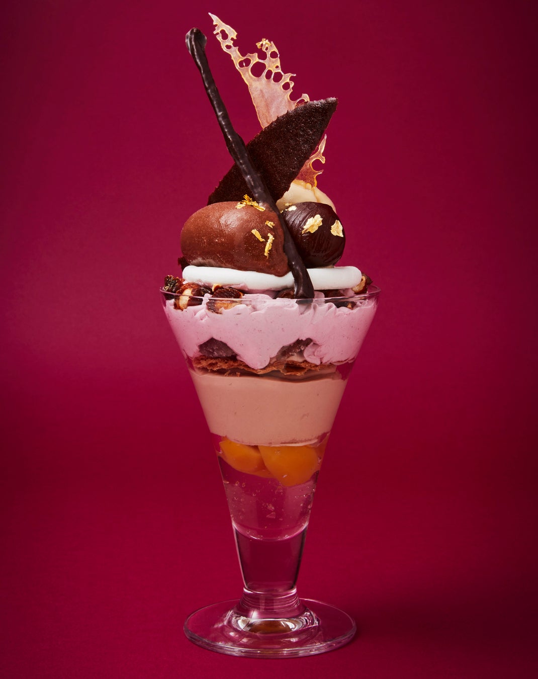 カカオ豆から手掛ける自家製チョコレートを随所に使用し、「栗」と組み合わせた季節限定パフェ。「獺祭 純米大吟醸 磨き二割三分」を使ったジュレ、コクのある香り高いメープルシロップを使用したメープルアイスや、いちご・フランボワーズ・カシスをミックスしたベリークリームを盛り込み、サクサクのパイ生地やフワッと軽いメレンゲで食感を楽しみながら食べ進めていく心躍る秋の限定パフェです。