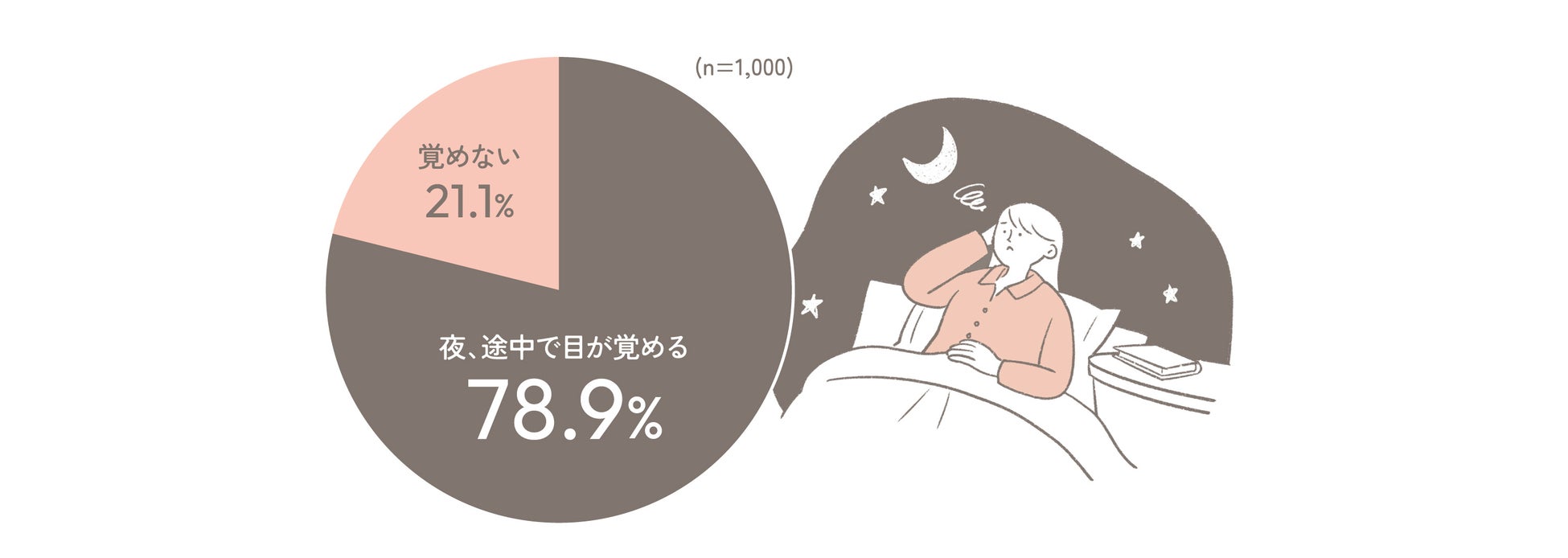 →約8割(78.9%)が「夜、睡眠の途中で目が覚めることがある」と回答。