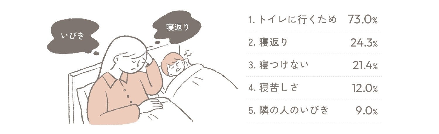 睡眠の途中で目が覚めてしまう方(n=789)に、「睡眠の途中で目が覚める理由やタイミング」を調査したところ、約7割(73.0%)が「トイレに行くため」と回答し、次に約2割(24.3%)が「寝返り」と回答しました。30代・40代の女性では、「隣の人のいびき」に多く回答する傾向がわかりました。
