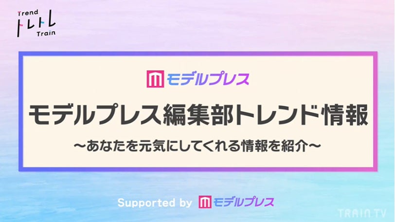 『モデルプレス』の情報が使用されるのは、「TRAIN TV」にて最旬トレンドをお届けする情報番組「トレトレ(Trend × Train)」。 「モデルプレス編集部トレンド情報~あなたを元気にしてくれる情報を紹介~」として、観光やグルメ、ホテルなどの情報を紹介していきます。