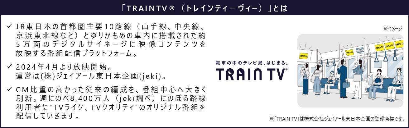株式会社ネットネイティブ(本社:東京都品川区、代表取締役社長:松下佳憲)が運営する日本最大級の女性向けエンタメ&ライフスタイルニュースサイト『モデルプレス』は、2024年11月4日(月)より、株式会社ジェイアール東日本企画(本社:東京都渋谷区、代表取締役社長:赤石良治、以下「jeki」)がJR東日本の首都圏主要10路線/ゆりかもめの車両サイネージで展開する番組配信プラットフォーム「TRAIN TV(トレインティーヴィー)」への情報提供を開始しました。