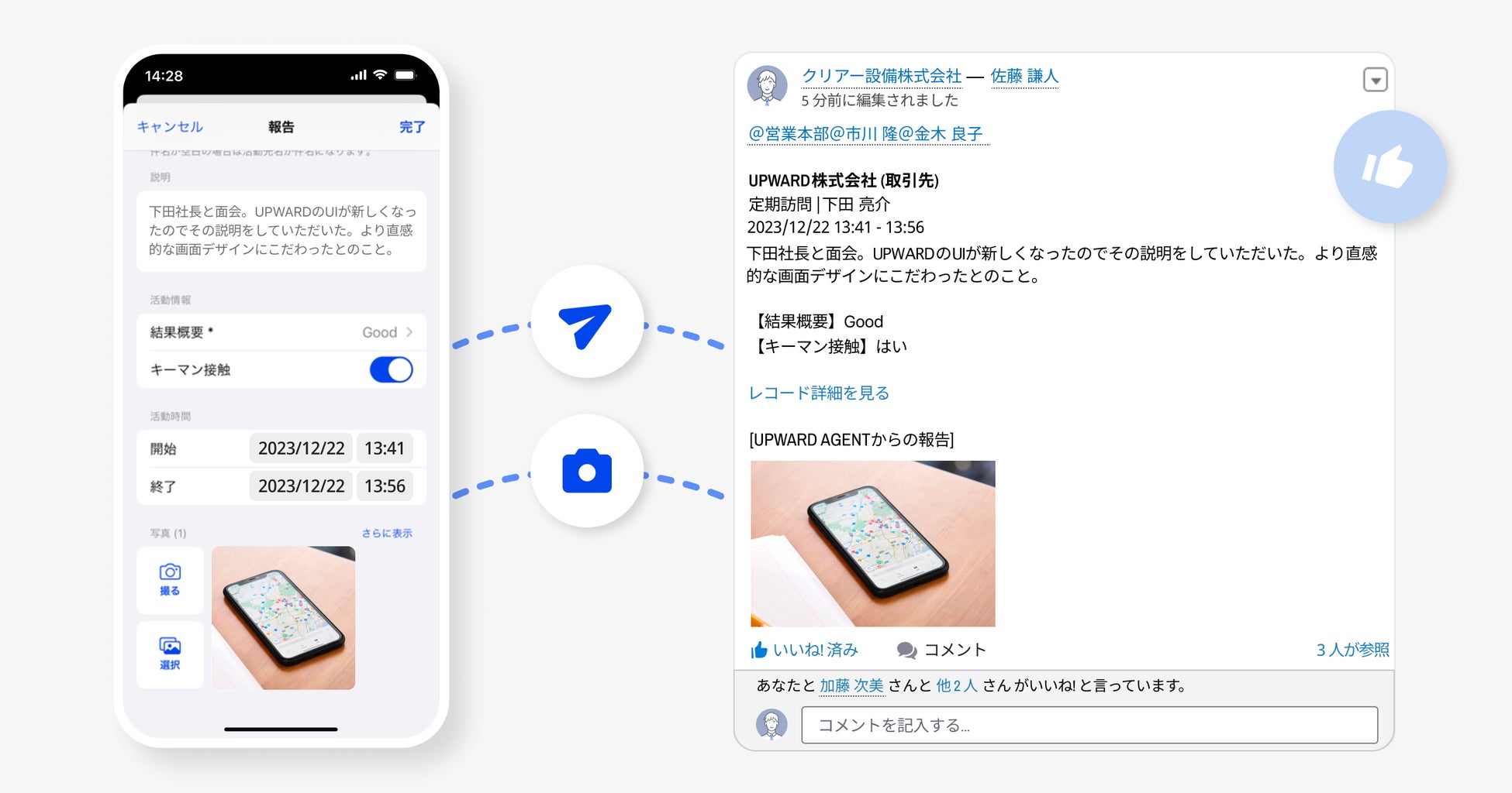 本リリースにより、UPWARD AGENTで行った活動報告の内容をChatterに投稿できるようになります。メンション先の人やグループの指定や、活動時に撮影した写真の投稿も行えます。