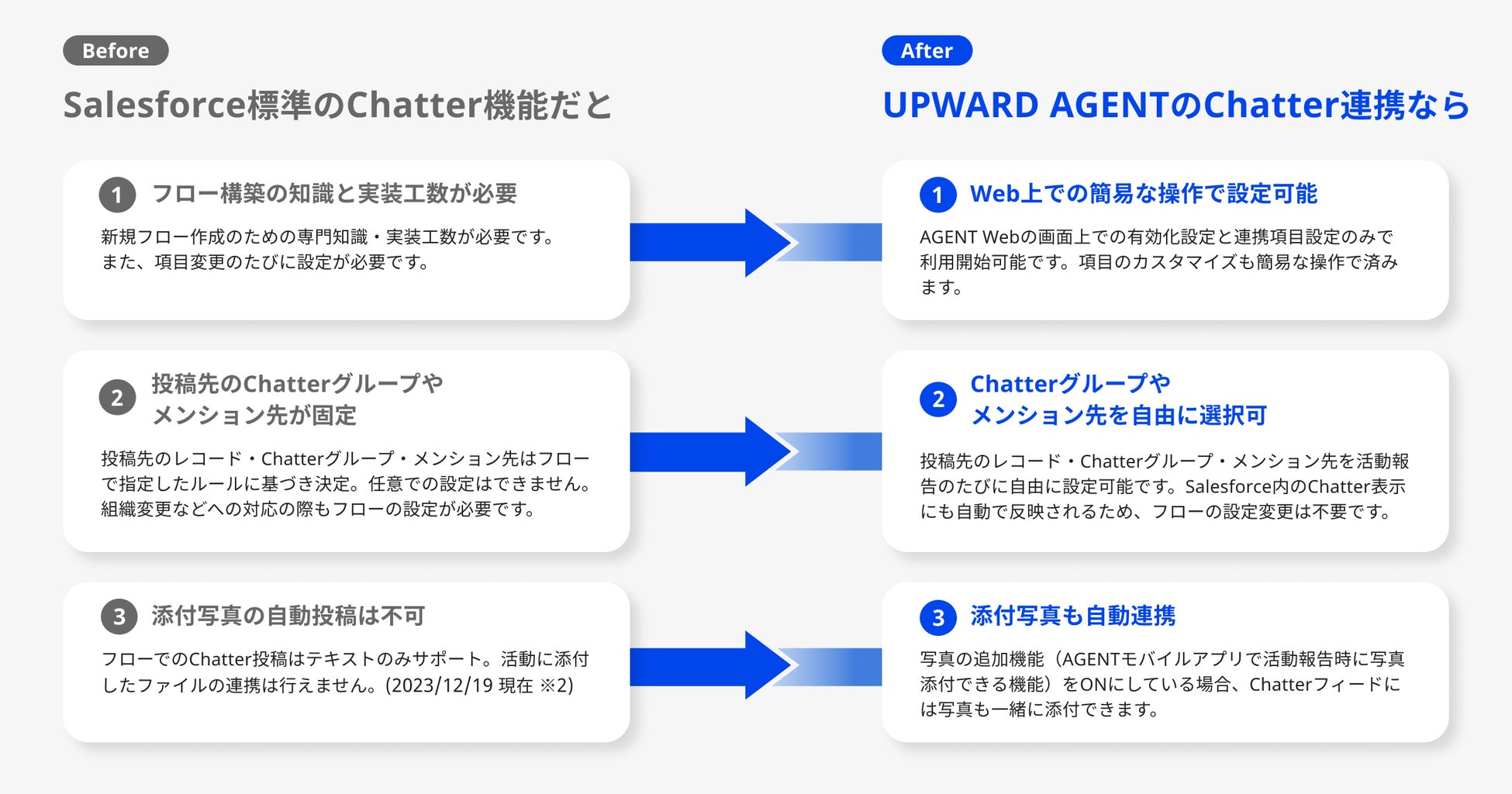 しかし、従来の標準機能によるUPWARD AGENTとChatterとの連携では、技術的なハードルが高く、投稿先の選択肢が限定されており、写真の添付なども困難でした。これらの問題を解決するために、Chatter連携機能をリリースしました。現場担当者がより理想的に活用できるよう支援し、CRM(顧客関係管理システム)の価値を最大化します。
