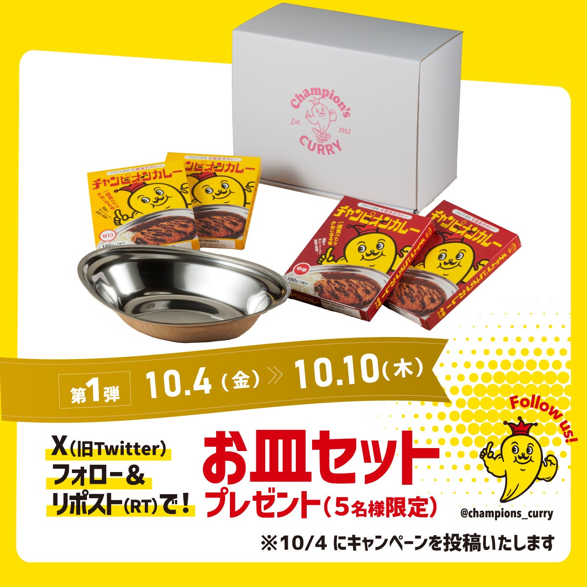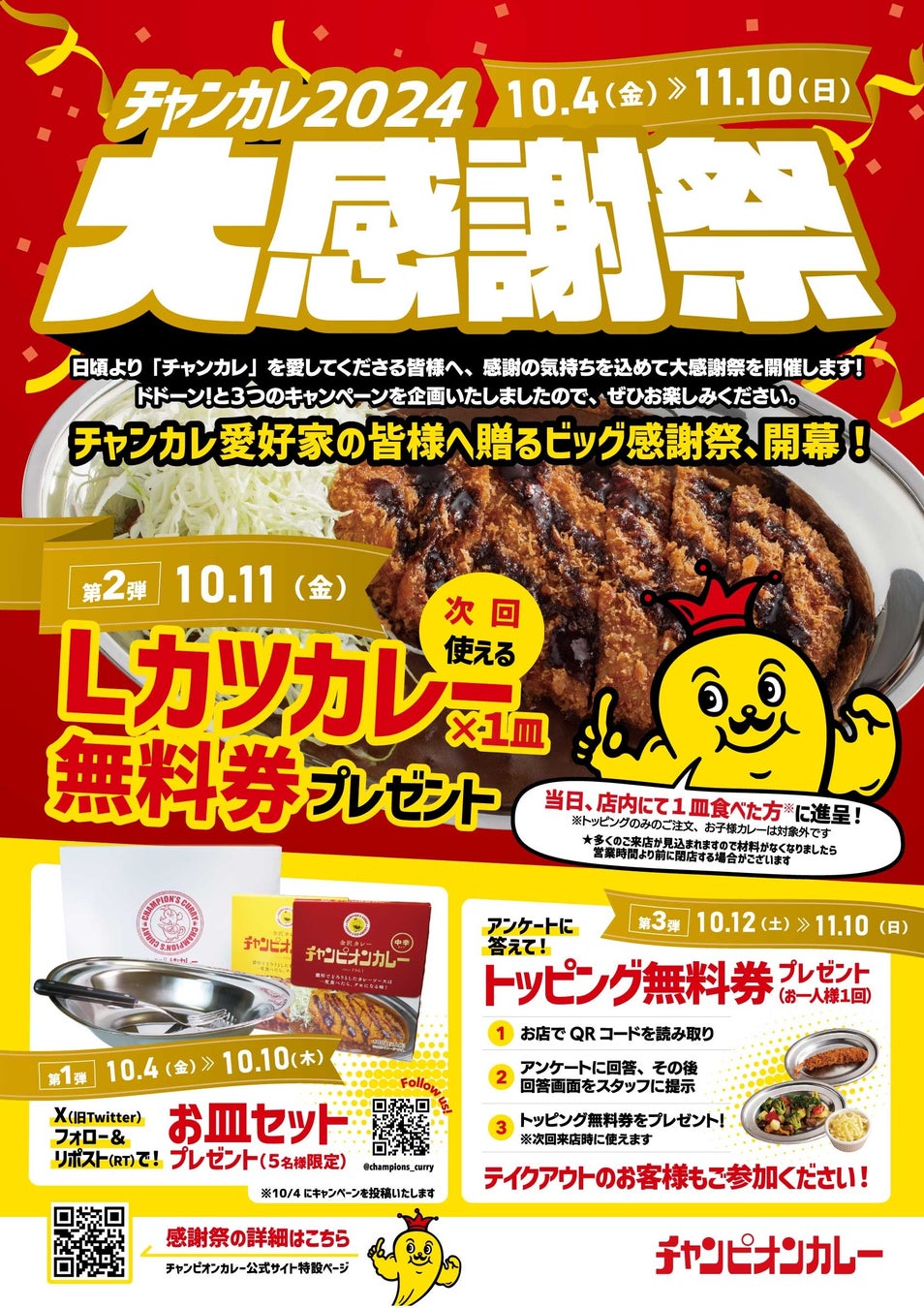 株式会社チャンピオンカレー(本社:石川県野々市市、代表取締役:南 恵太)は、お客様の日頃のご愛顧に感謝の気持ちを込めて、「チャンカレ大感謝祭」を2024年10月4日(金)~11月10日(日)まで実施いたします。去年初めて開催したこの企画。今回も店内にて1皿食べたら「Lカツカレー無料券」プレゼントや、Xキャンペーン、トッピング無料券プレゼント企画など、お得なキャンペーンを企画しましたので、ぜひお楽しみください。