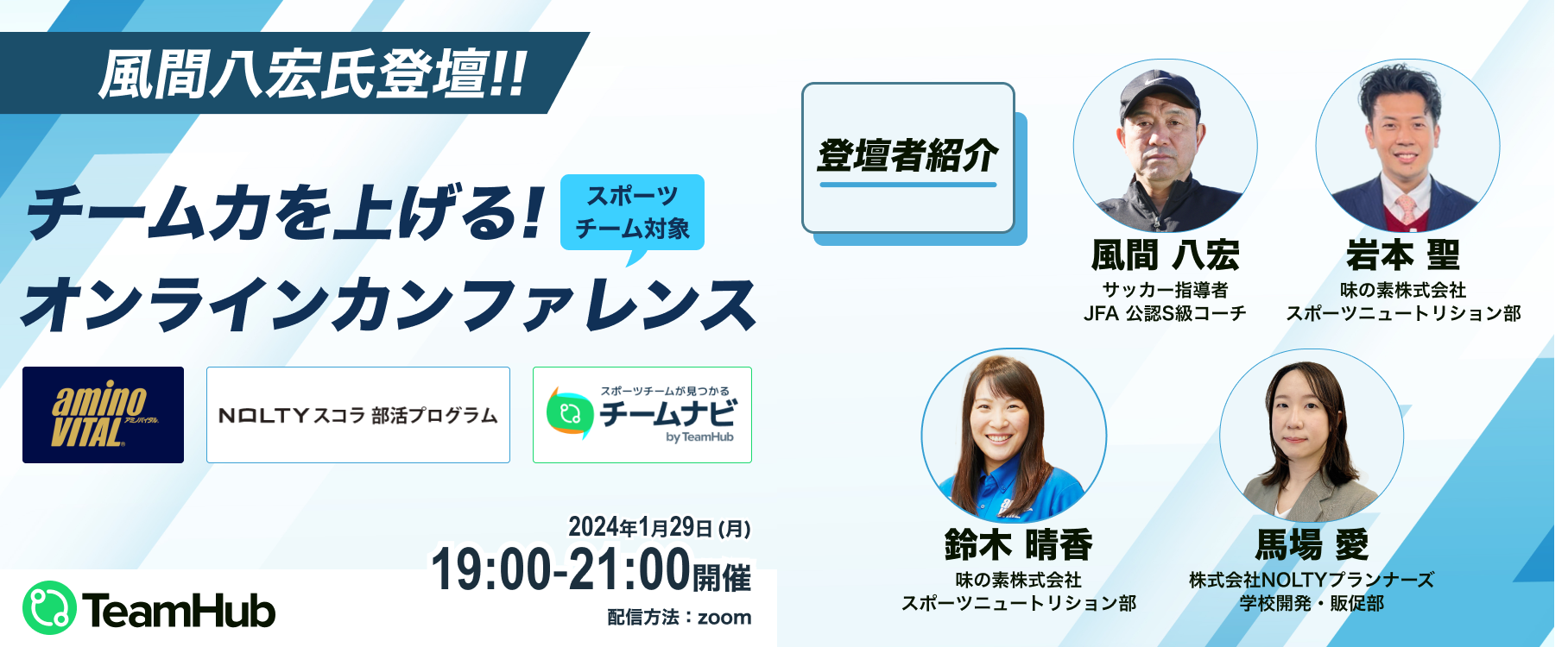本イベントは、『チーム力をあげる!』をテーマにスポーツ分野において各方面に長けた風間八宏氏、味の素、NOLTYプランナーズよりゲストをお招きし、スポーツ現場のリアルや商品の特徴・活用の実例をご紹介します。また、参加者特典として抽選で豪華なプレゼントも用意しています。