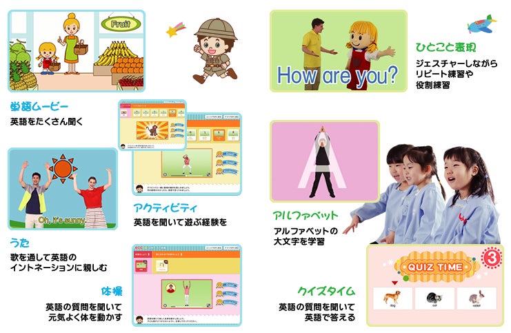 英語を聞きながら体を動かしたり、歌を通して英語独特のリズムを覚えたり、音声やキャラクターの映像を使ったりして、ICTによるALT(外国語指導助手)がいるレッスンと同様のプログラムを収録しています。
