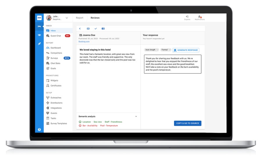 この度リリースされるクチコミ受信トレイとresponseAIの機能は、宿泊施設に多くのメリットをもたらすべく開発されました。新たなクチコミ受信トレイはクチコミ管理業務により効率的で合理的なワークフローをもたらし、クチコミ管理業務の担当者がゲストが投稿するクチコミコメントに素早くアクセスし、迅速に対応することを可能とします。さらに、resopnseAIは投稿されたクチコミコメントからゲストの肯定的(ポジティブ)および批判的(ネガティブ)な感情を認識し、それに応じたトーンに合った返答コメントを自動生成します。また、TrustYouのresponseAIは、多言語に対応できる翻訳機能を備えています。