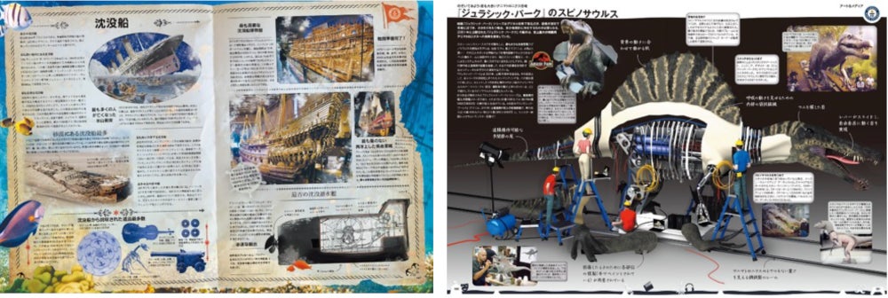 さらに一部を除く各チャプターにCGイラストによる解説ページ「のぞいてみよう」を新設。最大のタコ、最高額の車、「ジュラシック・パーク」のアニマトロニクス恐竜など、内部の仕組みをCGでわかりやすく解説します。