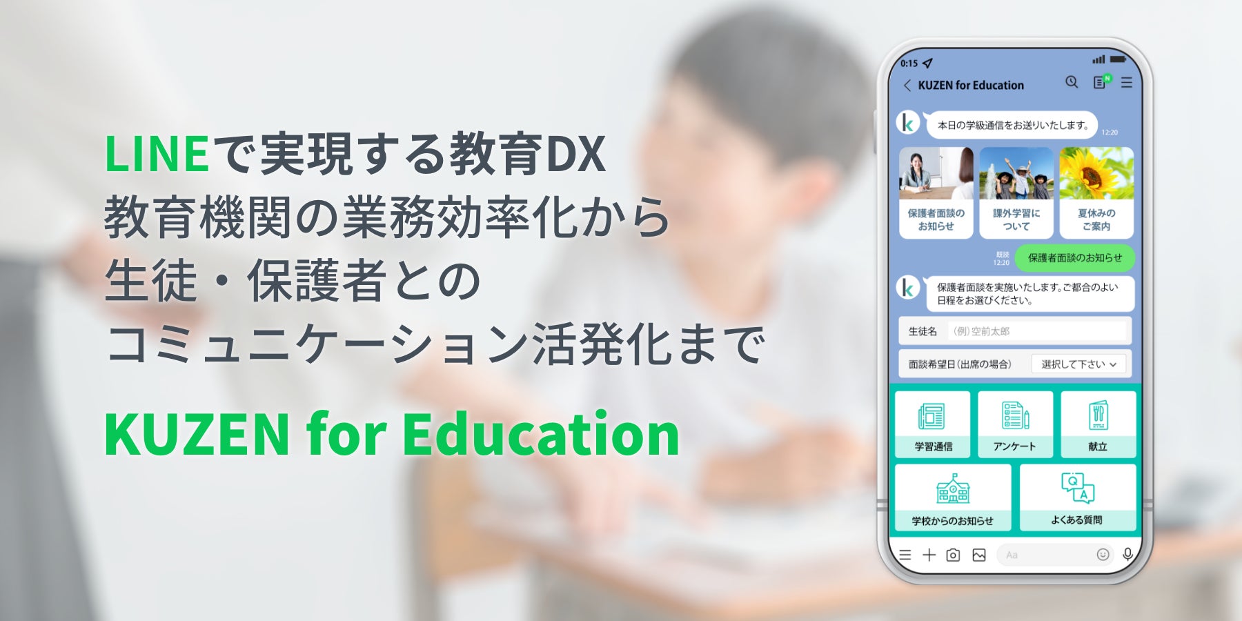 「KUZEN for Education」は、学校(大学を含む)、学習塾および各種スクールなど教育業界に向けたサービスです。当サービスの利用を通じて、LINE公式アカウントで入学を希望する生徒、既存生徒とのコミュニケーションの活性化促進等、教育業界のDX推進を支援してまいります。