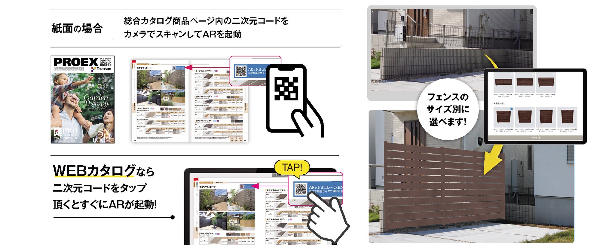 カタログとデジタルの融合をテーマとして、カタログ紙面からはもちろん、デジタルカタログからも簡単にWEBコンテンツやAR(拡張現実)シミュレーション体験など、DX(デジタルトランスフォーメーション)ツールとしてもお使いいただけるカタログとなっております。