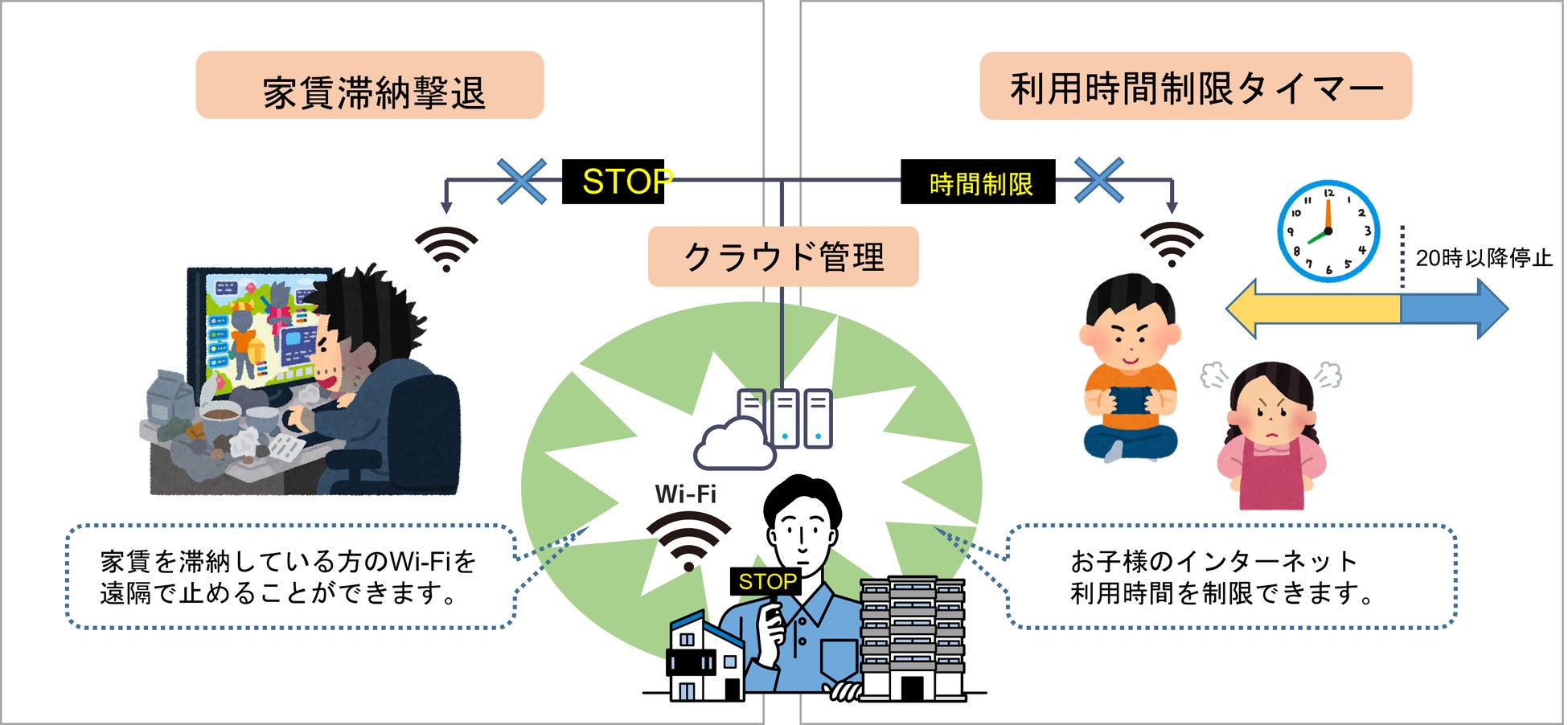 たとえば、家賃を滞納している入居者のみWi-Fi接続を止めることができます。