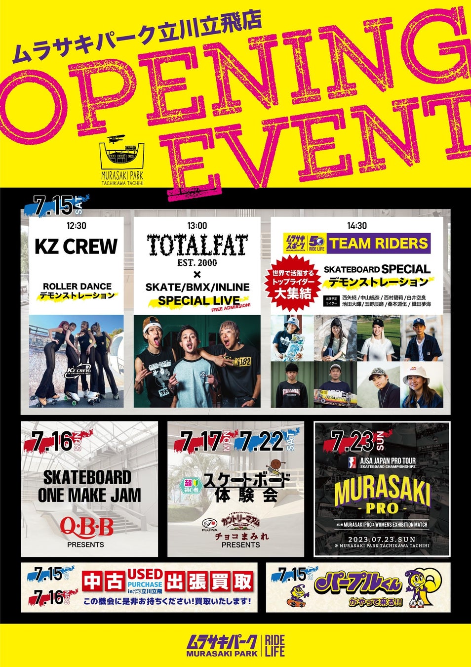初日である15日にはローラーダンスチーム「KZCREW」によるローラースケートダンスSHOWや、メロディックハードコアバンド「TOTALFAT」とアクションスポーツライダーとのセッション、東京五輪のオリンピアンも登場するムラサキライダーのデモンストレーションを実施いたします。
