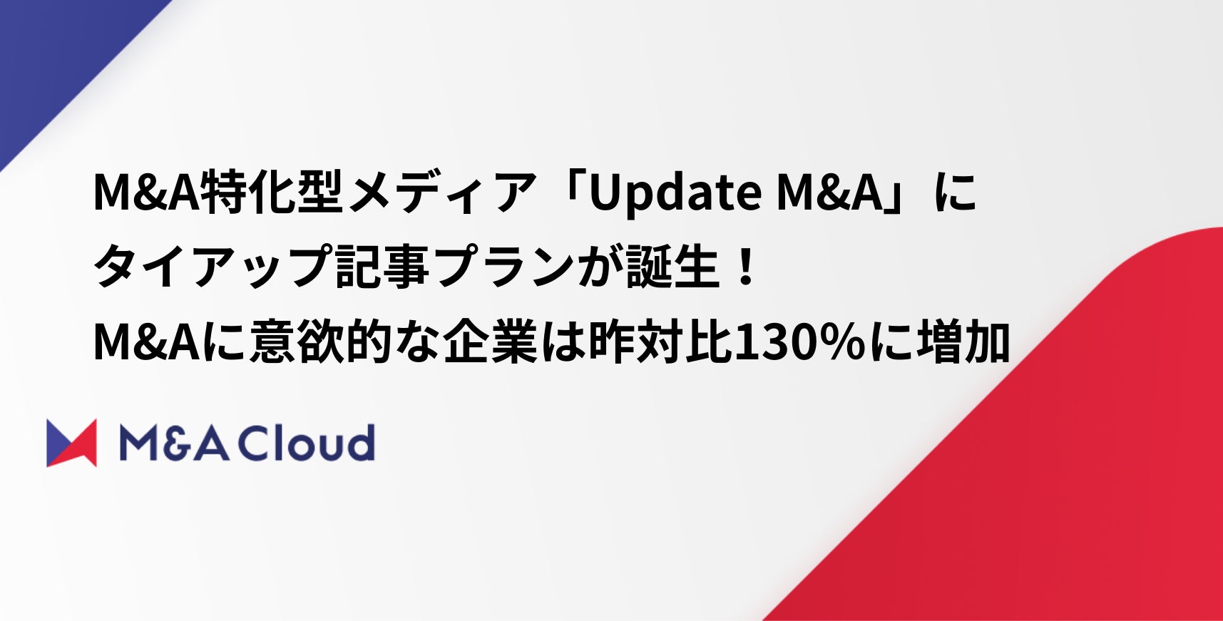 株式会社M&Aクラウド(本社:東京都千代田区、代表取締役CEO:及川厚博、以下「当社」)が運営するM&A特化型メディア「Update M&A」は、M&A発信ニーズの高まりを受け、この度「タイアップ記事プラン」の提供を開始しました。買い手企業のM&A戦略やPMI情報の発信を代行します。