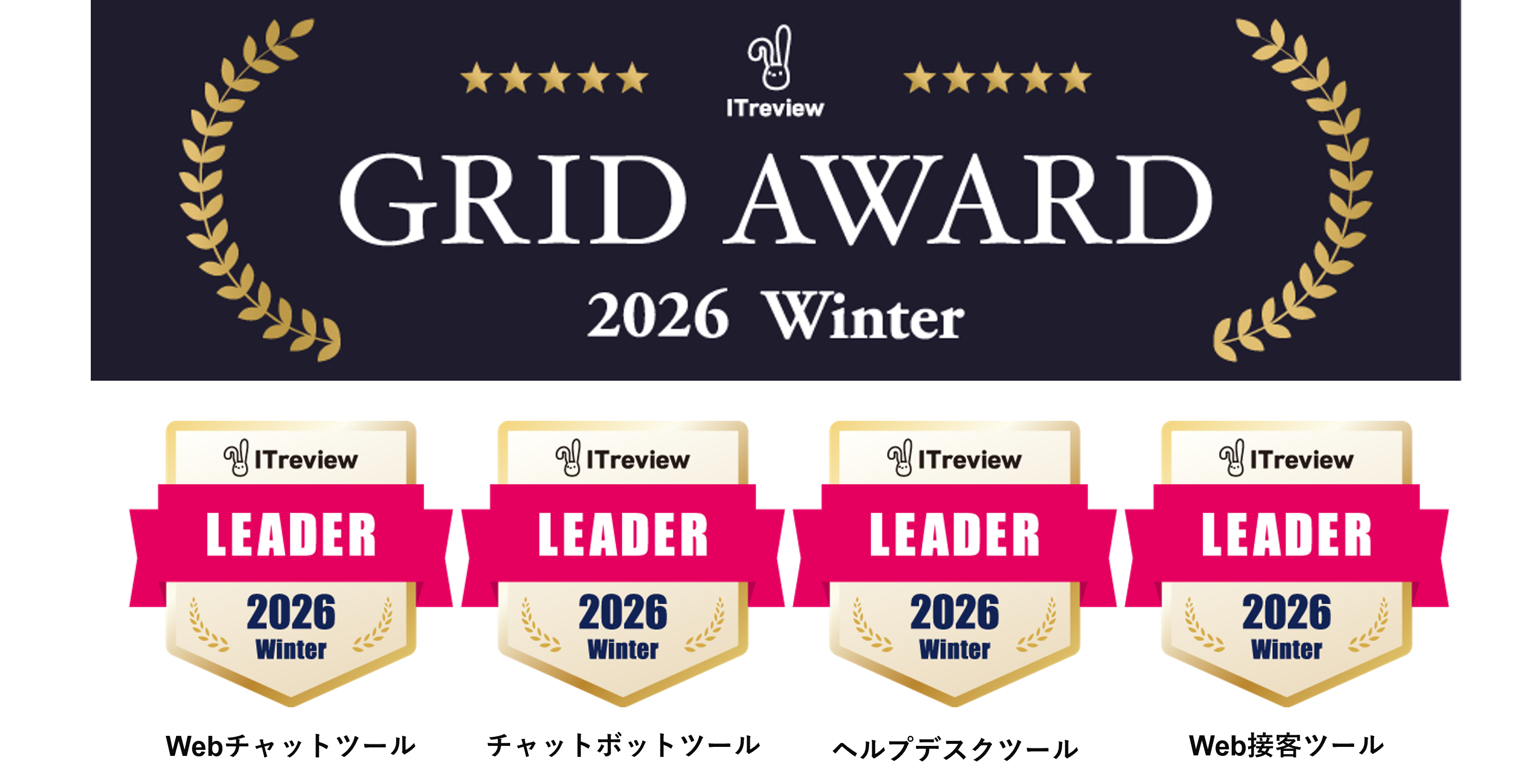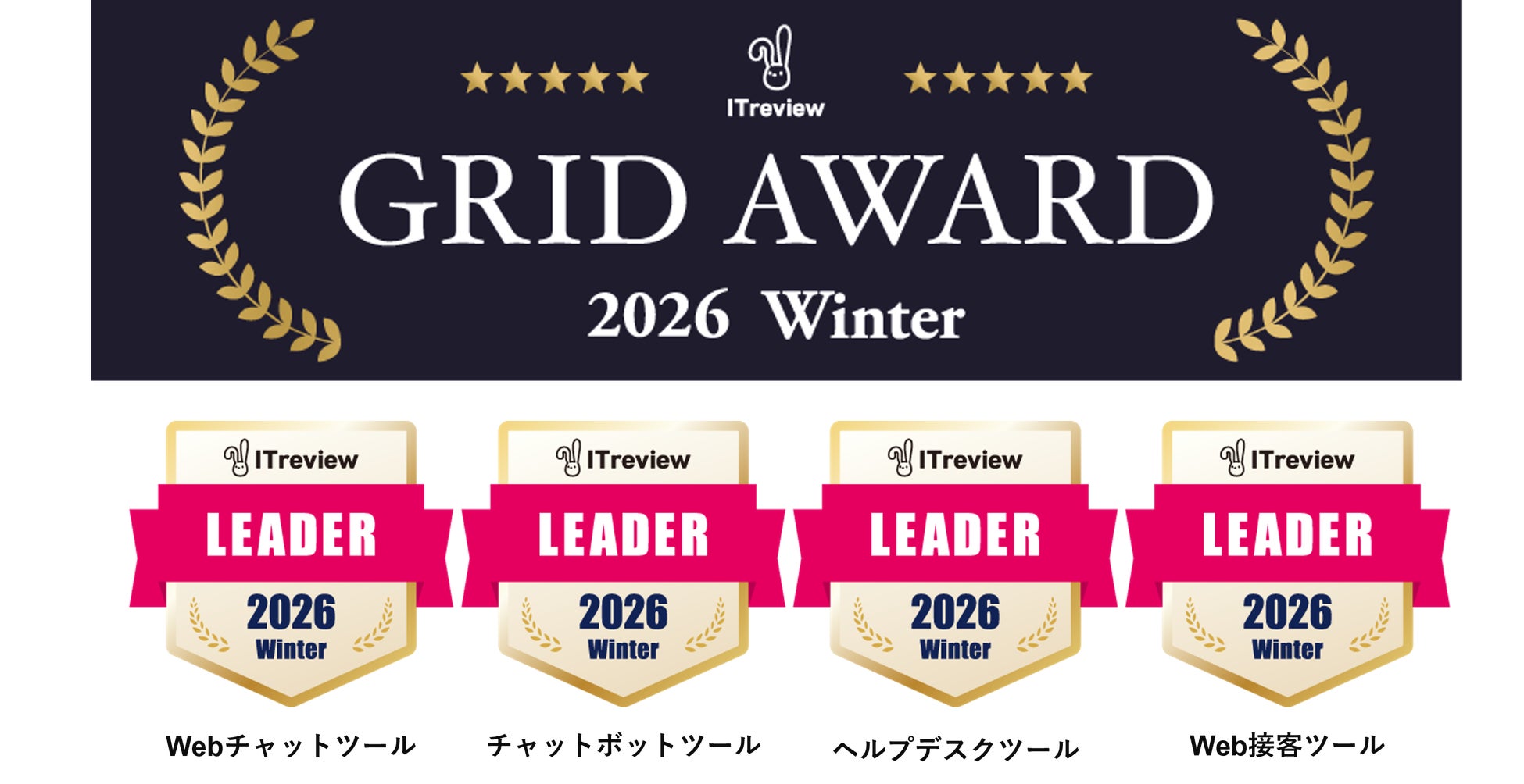 「Webチャットツール」、「Web接客ツール」、「チャットボットツール」、「ヘルプデスクツール」の4部門で26期連続Leaderを受賞
