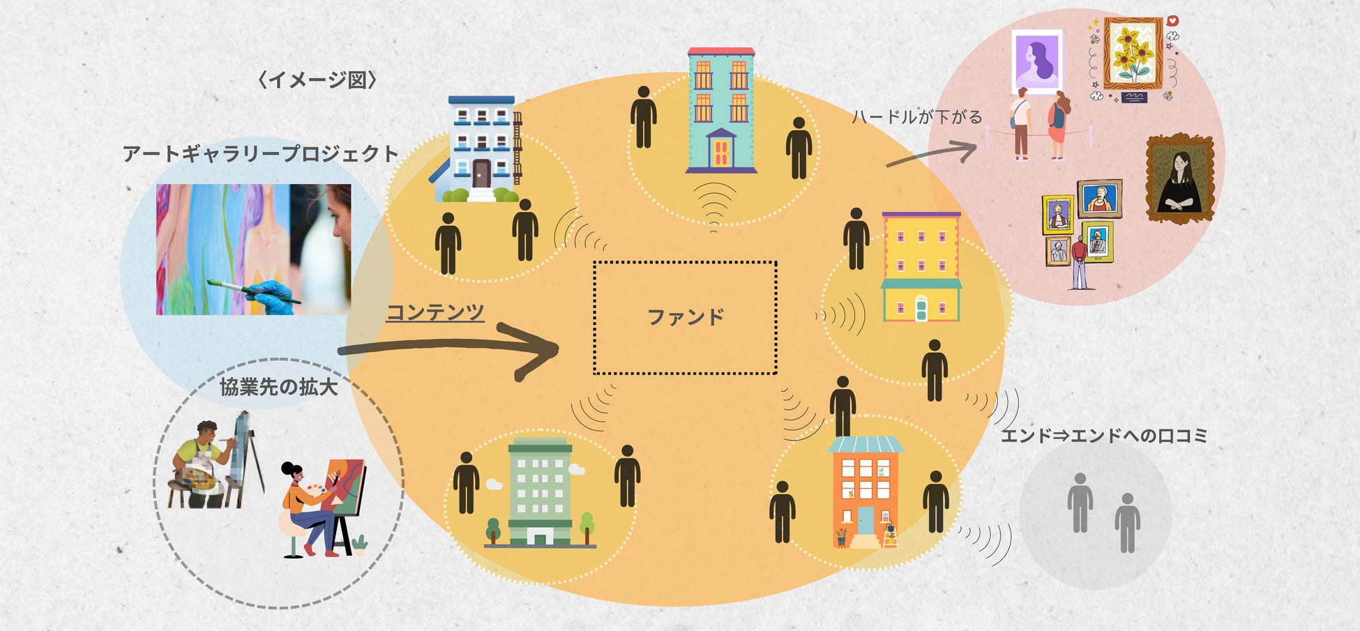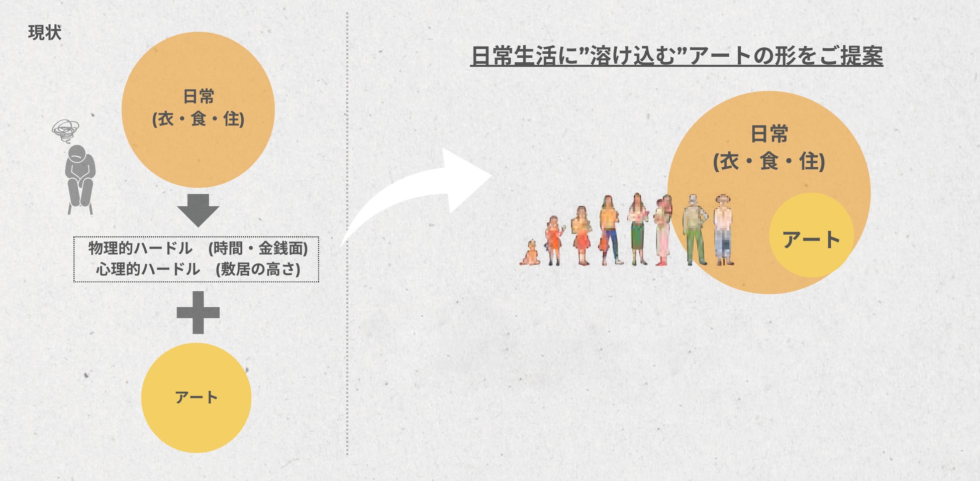 普段アートに馴染みのない方が日常生活以外でアートに触れようとすると、ご自身による能動的な情報収集や美術館やアートギャラリーに赴くといった物理的・心理的ハードルがあり、自ずとアートに触れる機会が少なくなっているのではないかと考えております。