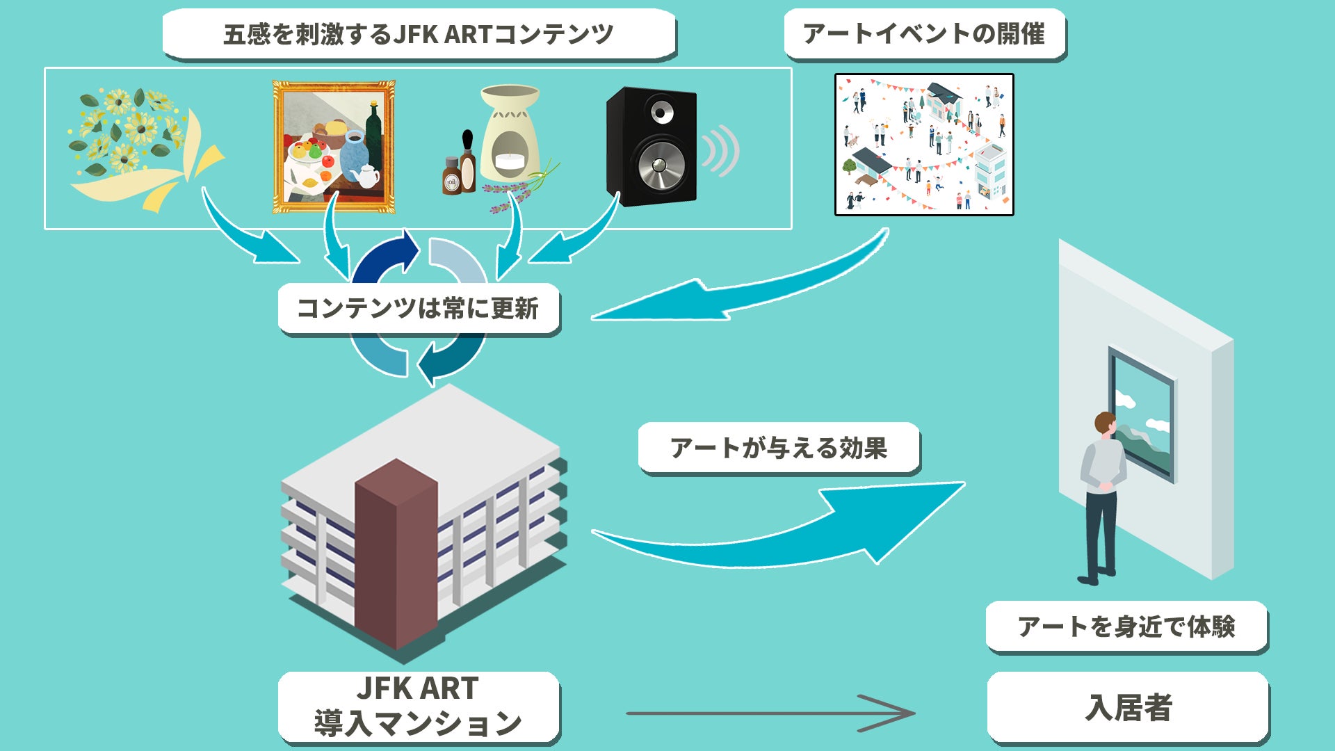 当社がアセットマネジメントを受託する複数の賃貸住宅に「JFK ART」を導入することで、複数物件にまたがった入居者コミュニティ組成をしたり、アートコンテンツの導入にご協力いただくアーティストとの連携により合同イベントを行う等、入居者様の満足度向上に向けた施策を行って参ります。