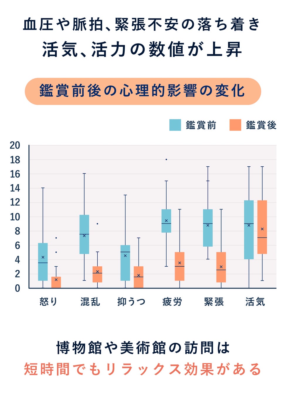 美術鑑賞の前後で血圧や脈拍の生理測定と心理検査を行い、体と心がどのように変化するかの研究の結果、全国60館以上、800名を超えるデータから博物館や美術館に訪問することで血圧と脈拍は緩やかに下がったほか、心理面では緊張不安が下がり、活気活力の数値が上がる傾向が発見されました。