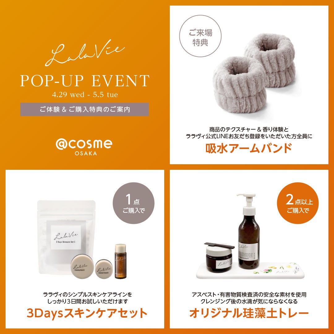 これに伴い、一般発売に先駆けて、@cosme OSAKAおよび@cosmeSTORE/MiSUGI (なんばウォーク店 ・天満橋京阪シティモール店)にて、「ソフトクッション クレンジングオイル」の先行販売を行います。ララヴィの人気商品も実際にお試しいただける期間限定のPOP-UPイベントです。