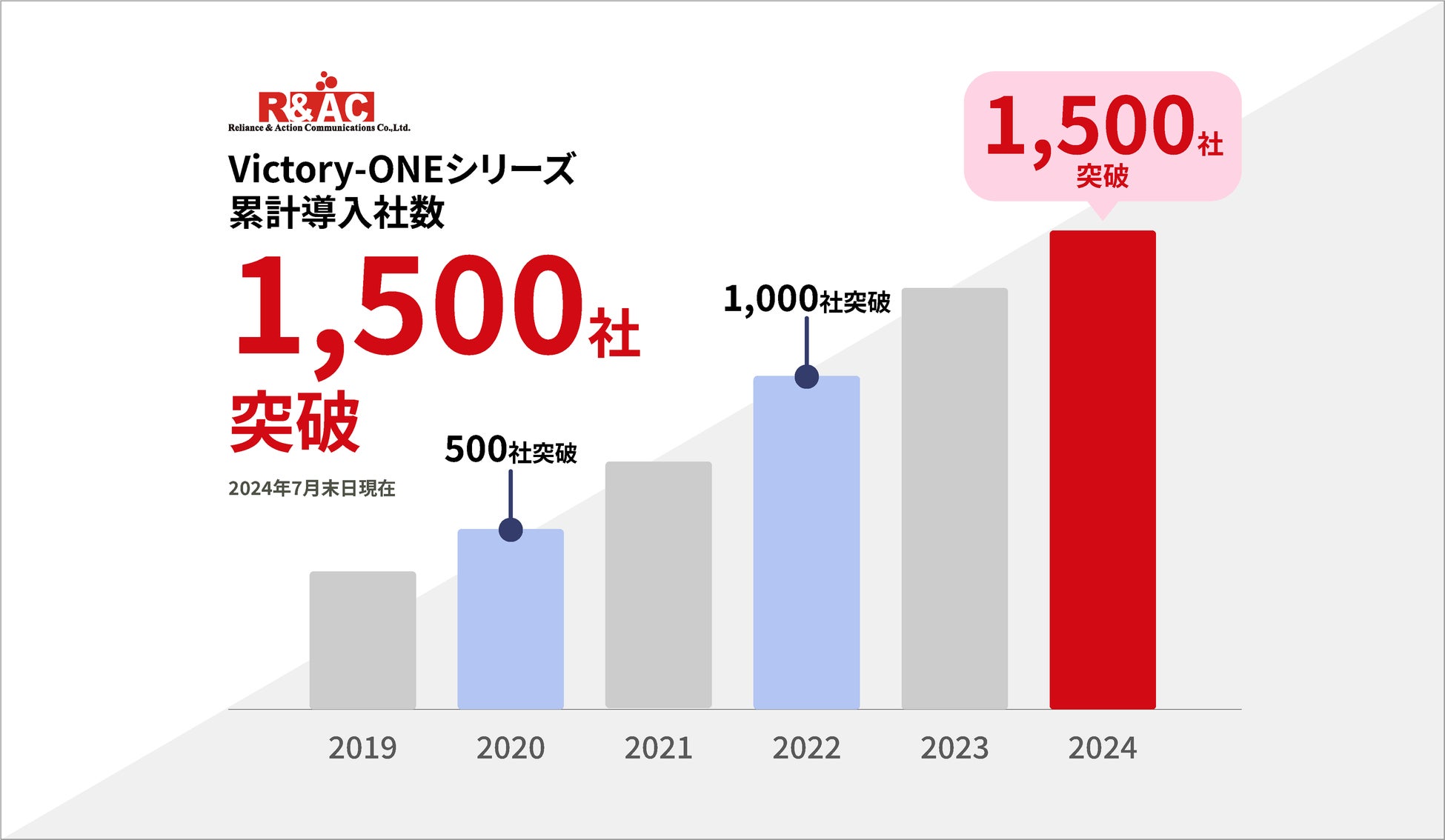 R&ACは創業から2024年で20周年を迎え、長きに渡り入金消込業務を中心とした入金消込・債権管理システム「Victory-ONEシリーズ」の開発に特化してきました。2020年には500社、2022年には1,000社を超え、2024年で累計導入社数1,500社を突破しました。創業当時の事業である受託開発・パッケージソリューションに加え、現在の主力である「V-ONEクラウド」を中心としたクラウド事業を展開し、直近5年間で多くの方へご利用いただけましたことを心より感謝申し上げます。
