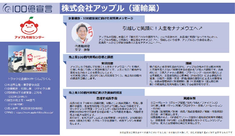 株式会社アップル(本社:東京都中央区、代表取締役:文字 放想、以下「アップル」)は、企業の成長ポータルサイトにて「100億宣言」を発表いたしました。 当社は、「引越しで笑顔に!人生をナナメウエへ」というパーパスのもと、2030年に売上高100億円の達成を目指します 。さらに、この100億円をあくまで“通過点”と位置づけ、2034年には売上高500億円規模への拡大と、業界内での確固たる地位【日本一】を目指してまいります 。