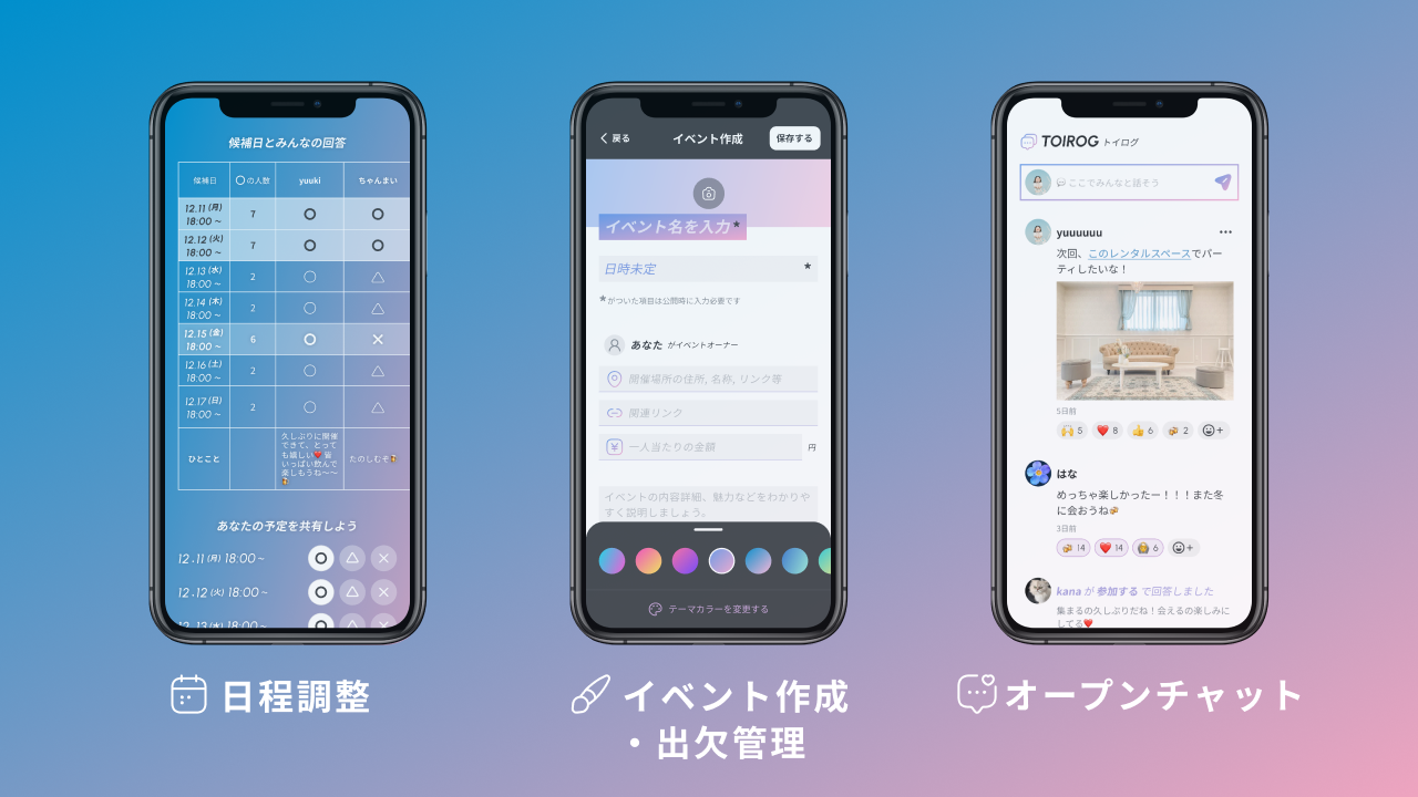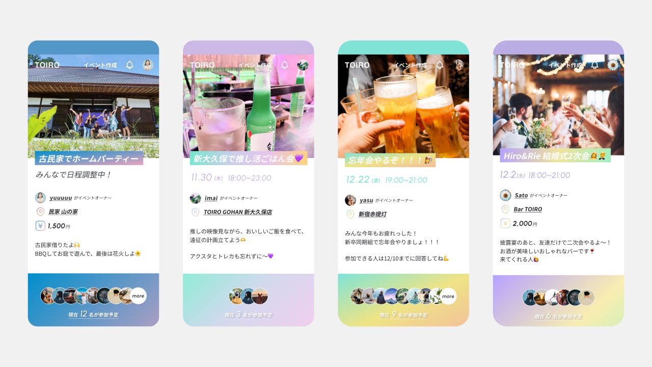 明日の飲み会も、季節的な行事も、旅行も。すべてのイベントを「TOIRO」ひとつで。