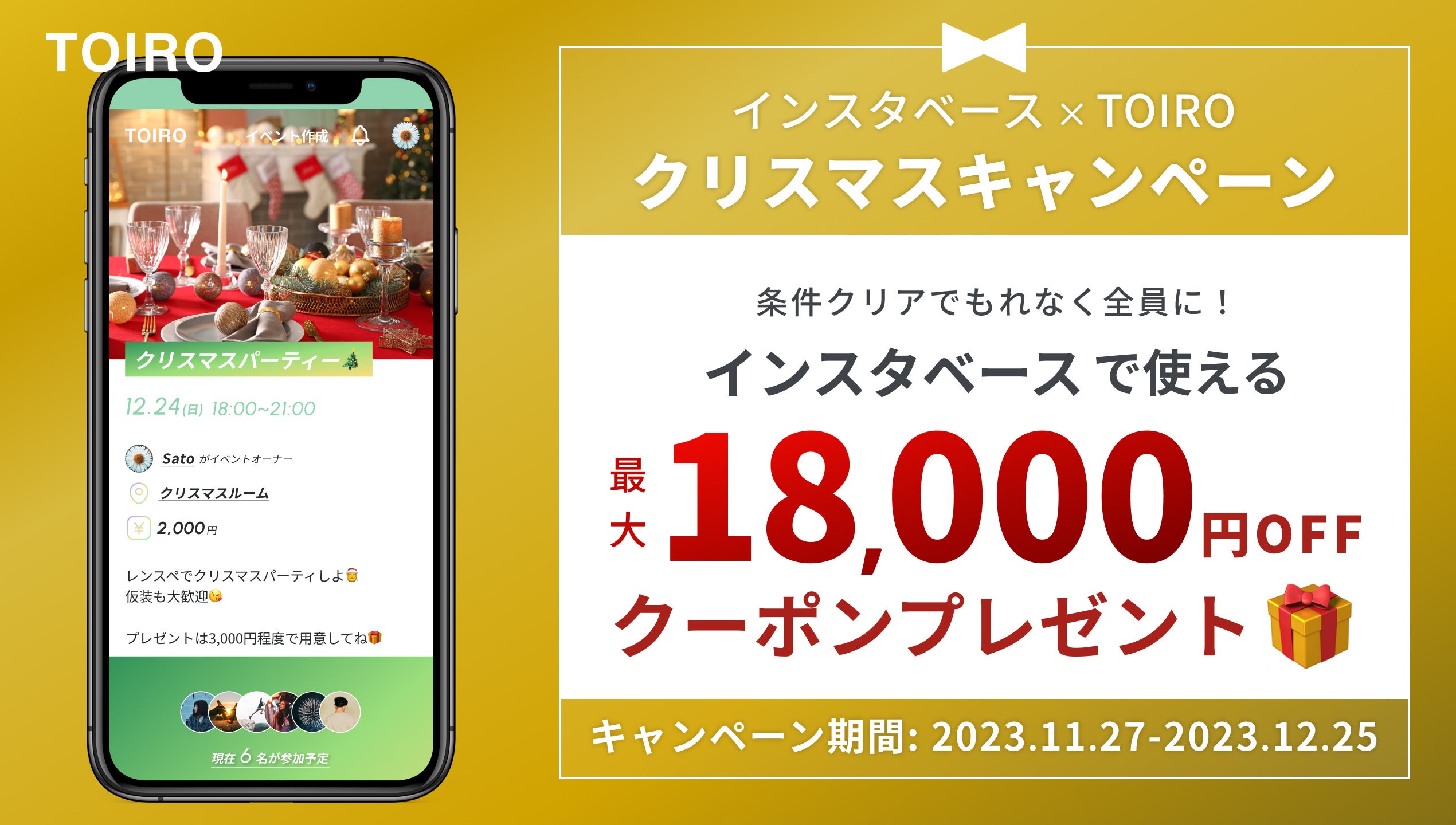 TOIROのリリースを記念し、レンタルスペースの予約プラットフォーム「インスタベース」とコラボした「インスタベース×TOIROクリスマスキャンペーン」を開催いたします。
