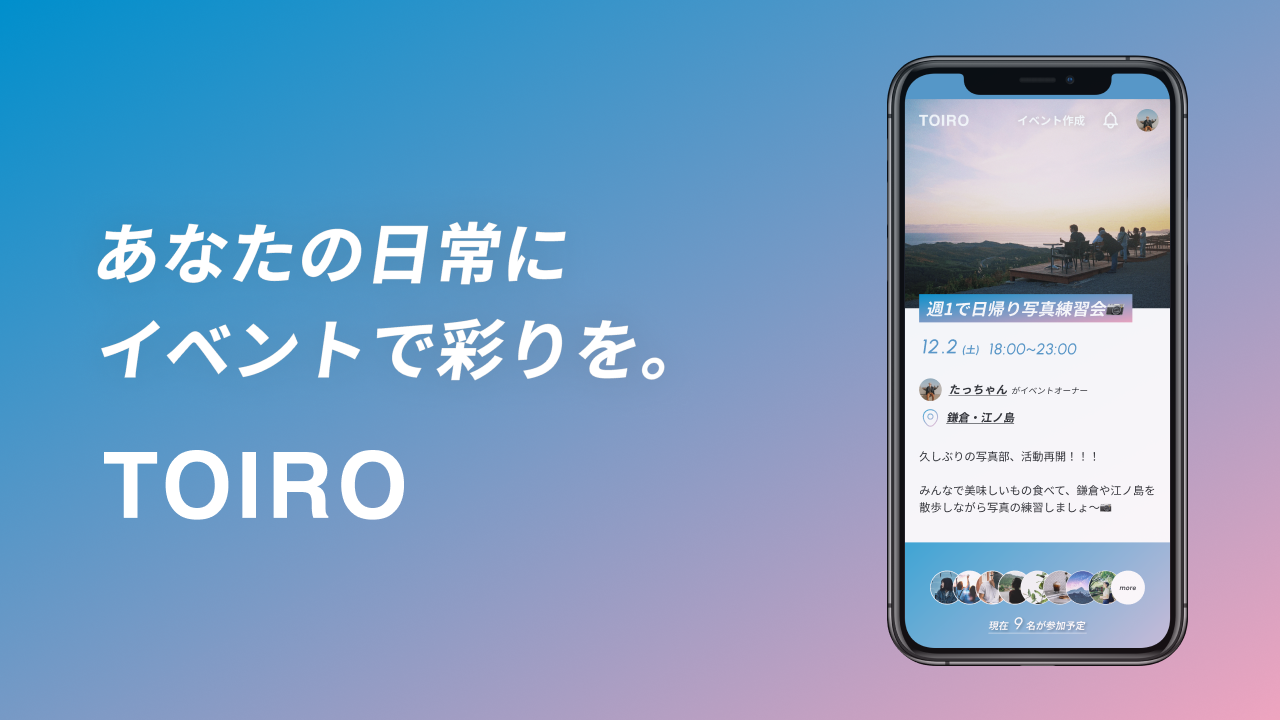 TOIRO(https://toiro.com)は、コミュニティイベントサービスです。誰でも簡単にイベントを開くことや招待されたイベントに参加できるだけでなく、日程調整からイベント終了後の思い出共有まで、これまでにない新たなイベント体験を提供いたします。