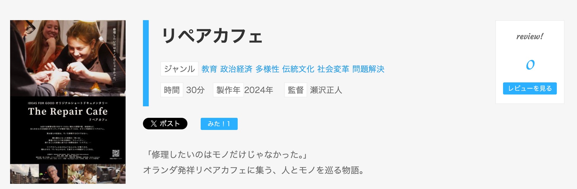 【cinemo『リペアカフェ』作品ページ】https://www.cinemo.info/137m