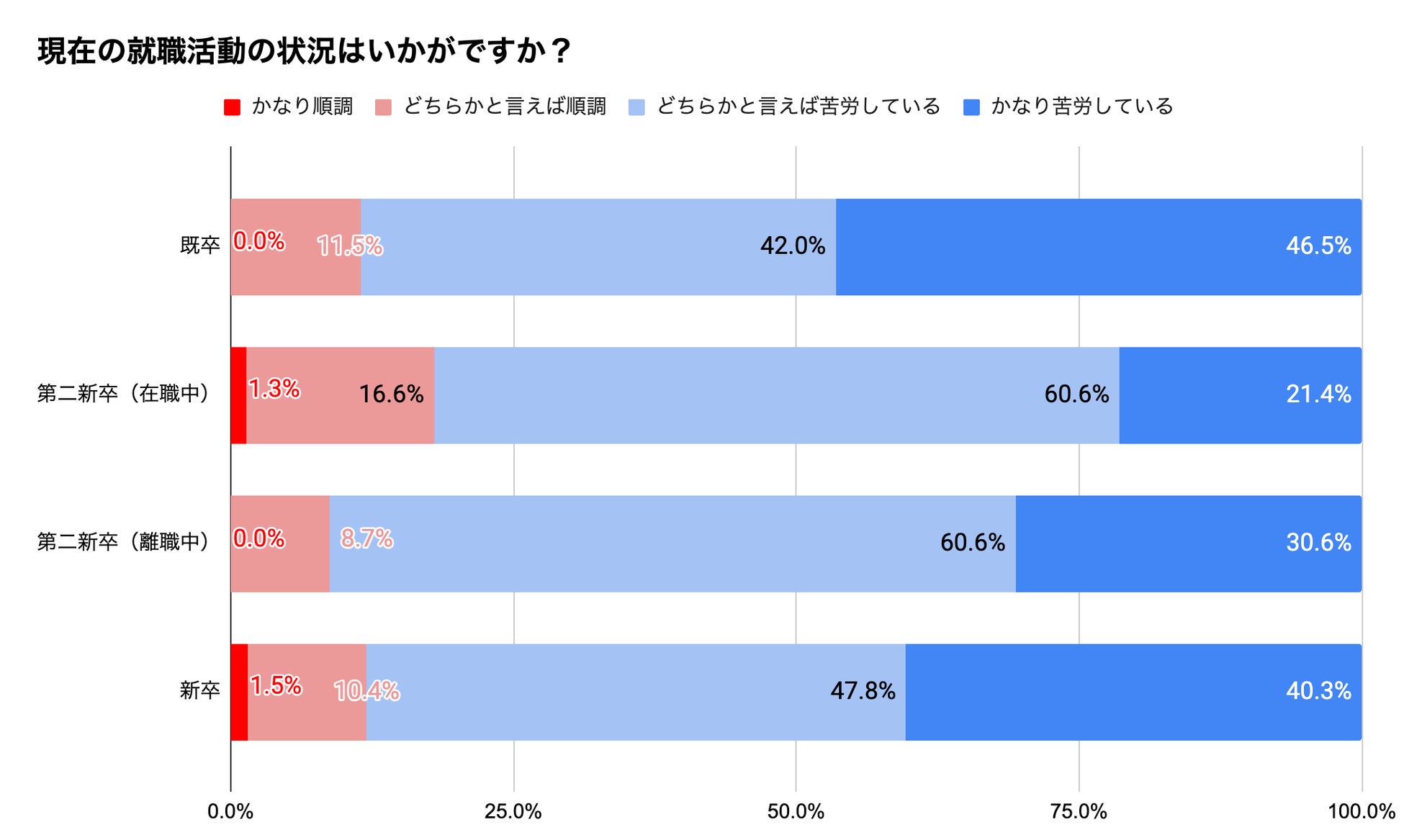 ・どちらかと言えば苦労している(既卒 42.0%、第二新卒/在職中 60.6%、第二新卒/離職中 60.6%、新卒47.8%)