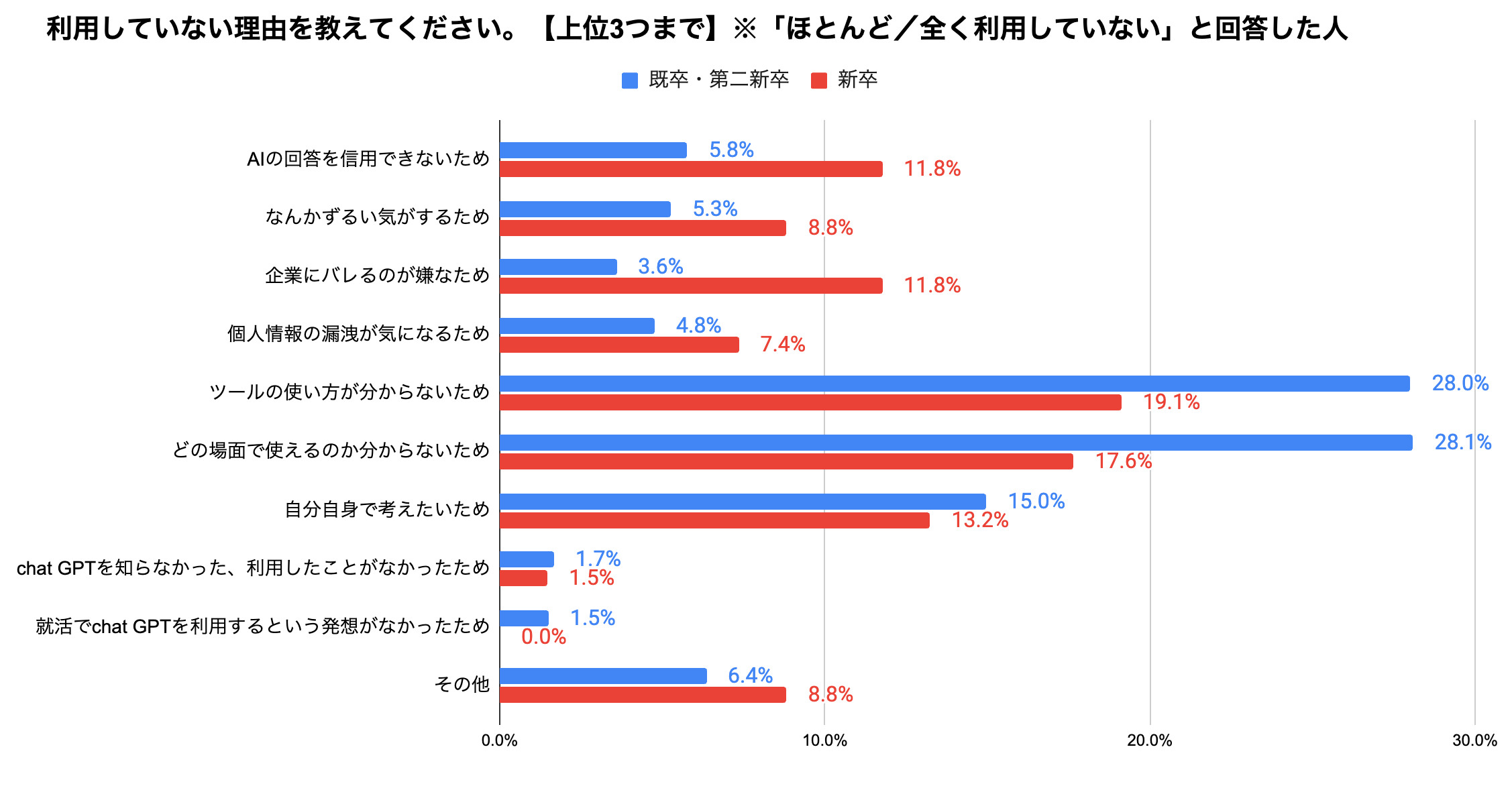 ・就活でchat GPTを利用するという発想がなかったため(既卒・第二新卒 1.5%、新卒 0.0%)