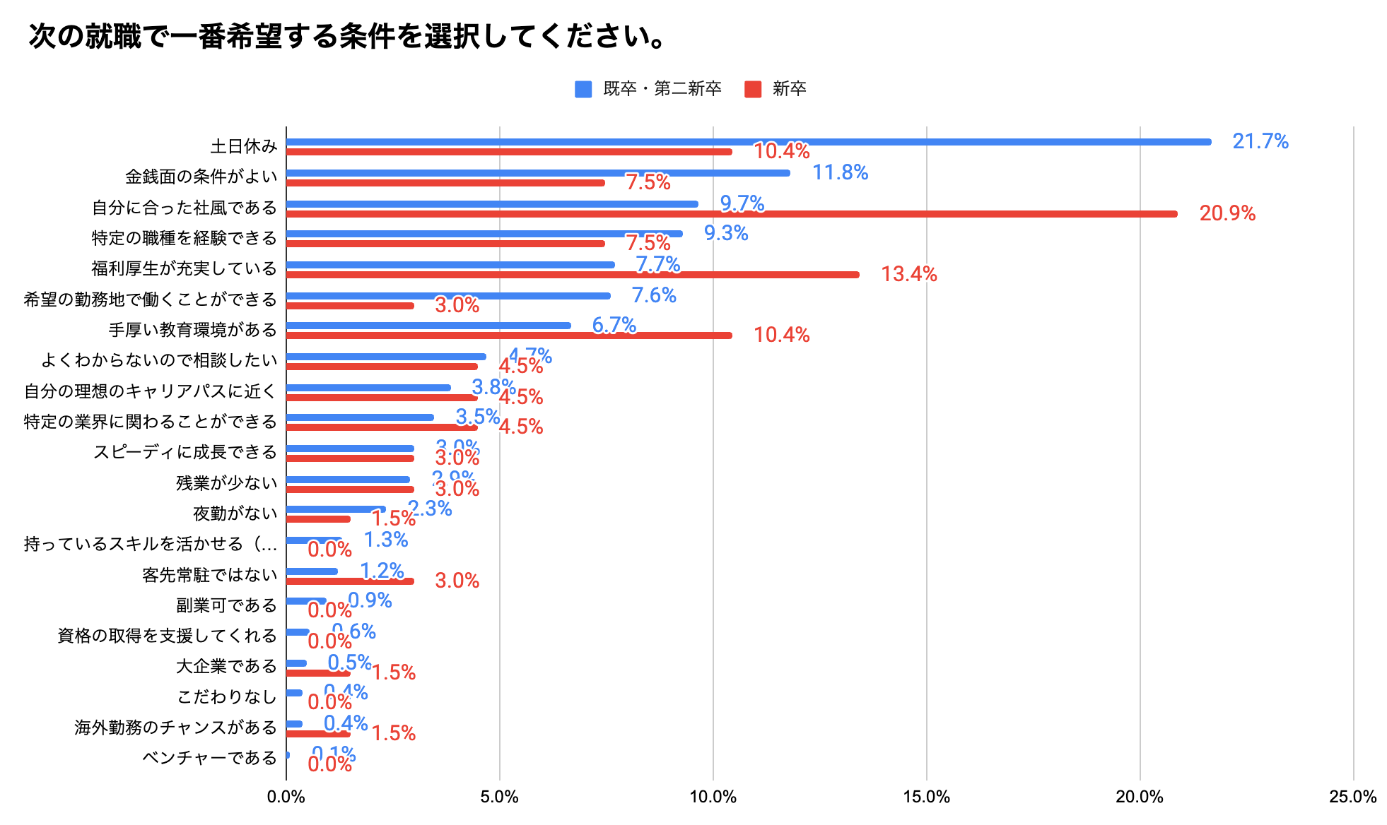 次の就職で一番希望する条件の最多は、既卒・二卒が「土日休み」で2割、一方新卒は「自分にあった社風」が2割と回答が分かれる結果に。
