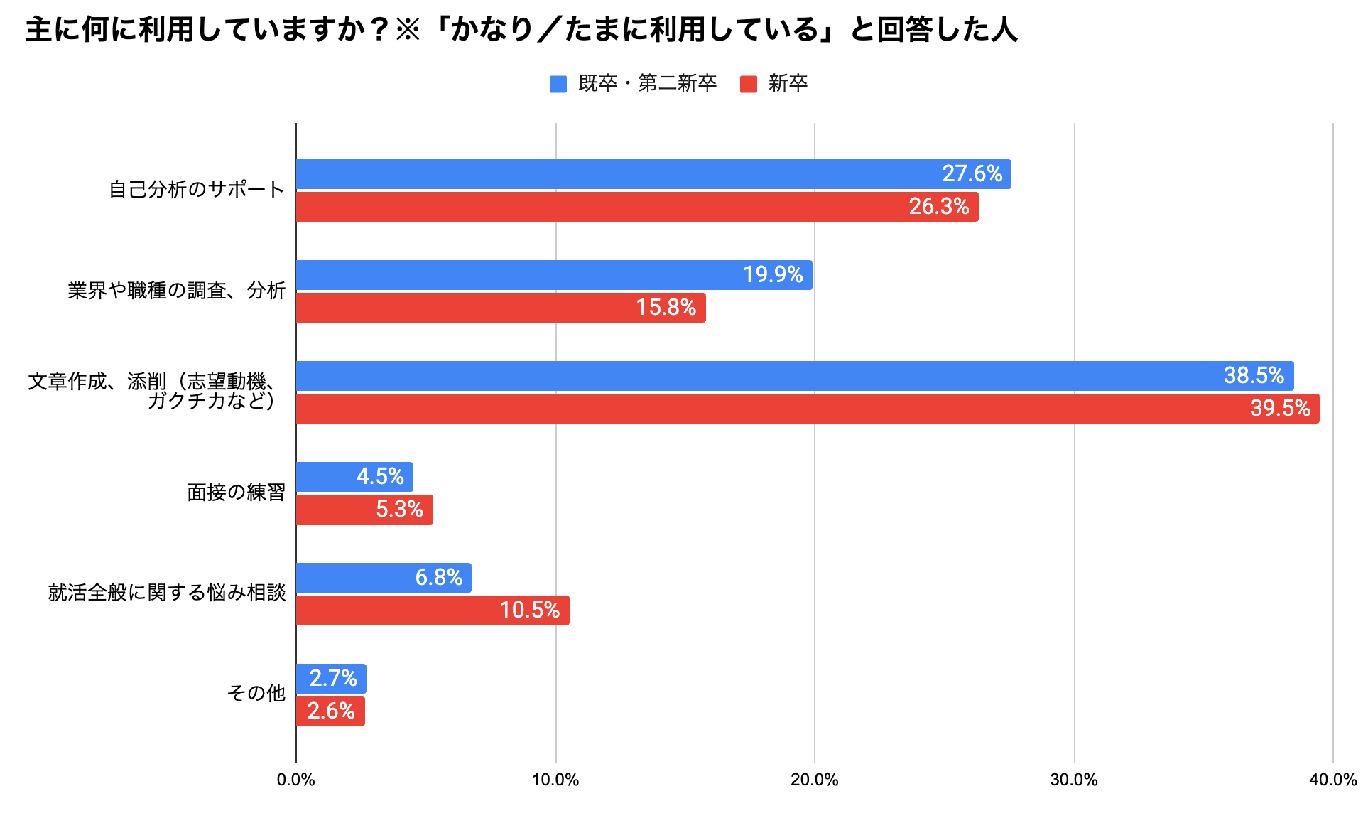 ・文章作成、添削(志望動機、ガクチカなど)(既卒・第二新卒 38.5%、新卒 39.5%)