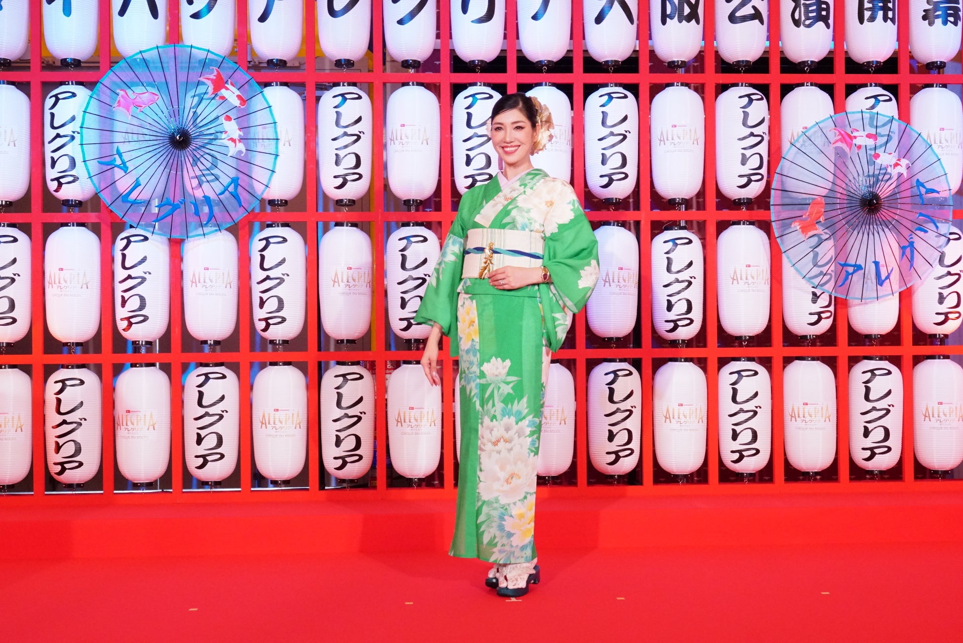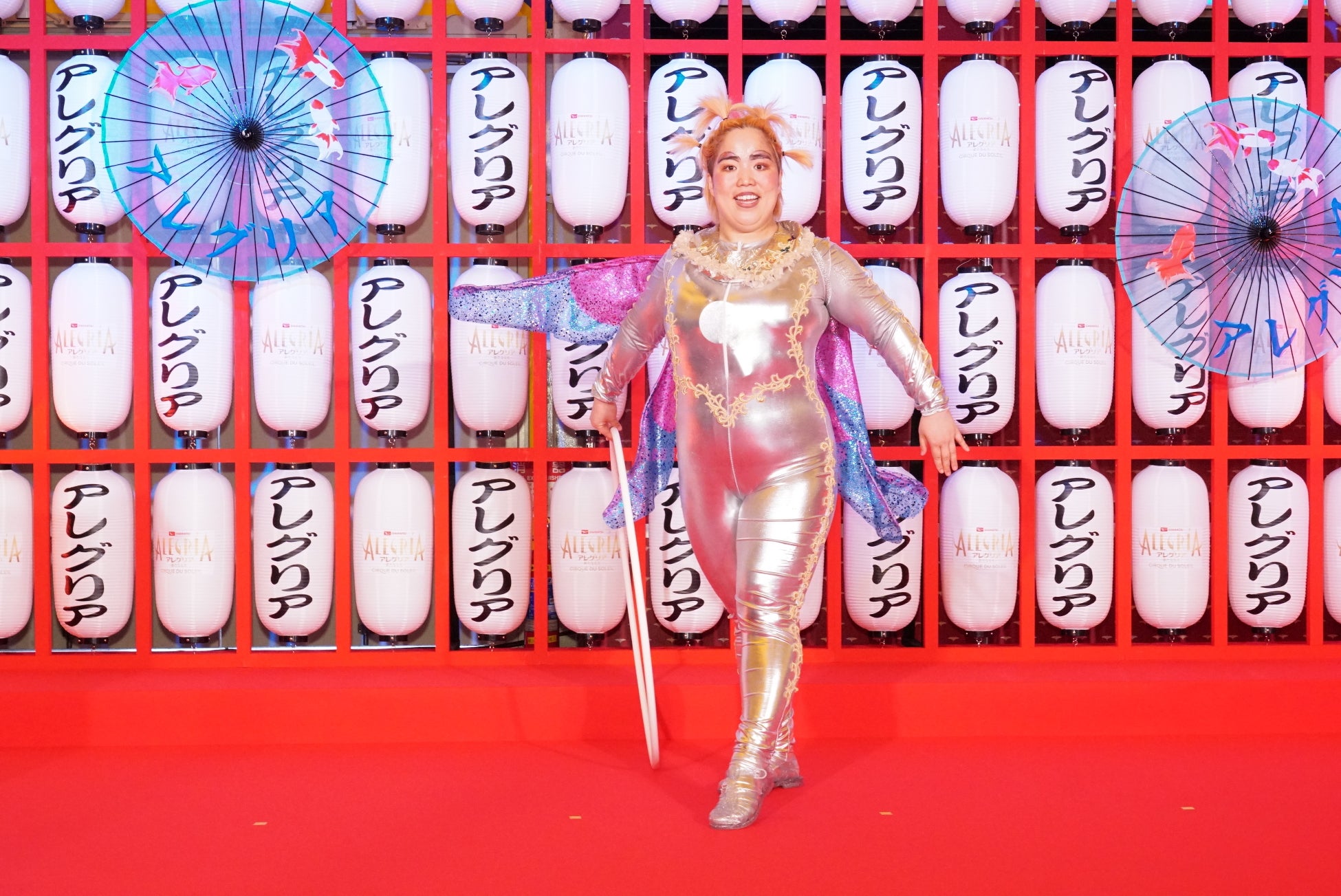 続いてレッドカーペットへ姿をあらわしたのは艶やかな浴衣姿のアン ミカさん。アレグリアの赤に映えるように緑で真夏のフェスティバルをイメージしてみたというアンさんは「アレグリアは世界で唯一無二の身体表現と生の音楽や照明が組み合わさった総合芸術。観ると明日から生きる元気が出ます!ハッピー!ラッキー!アレグリア!」と語ってくれました。