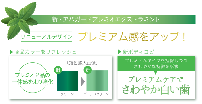 カラーは上品でリッチな色合いのゴールドグリーンに変更。ボディコピーは「プレミアムケアでさわやか白い歯」にリフレッシュ。さらに、シリーズ1番人気である「アパガードプレミオ」と今回リニューアルしたすっきりミントフレーバー「アパガードプレミオエクストラミント」のプレミアムタイプ2品の中から、自分にあったプレミオを選んでいただく“選ぶ楽しさ”も提案していきます。