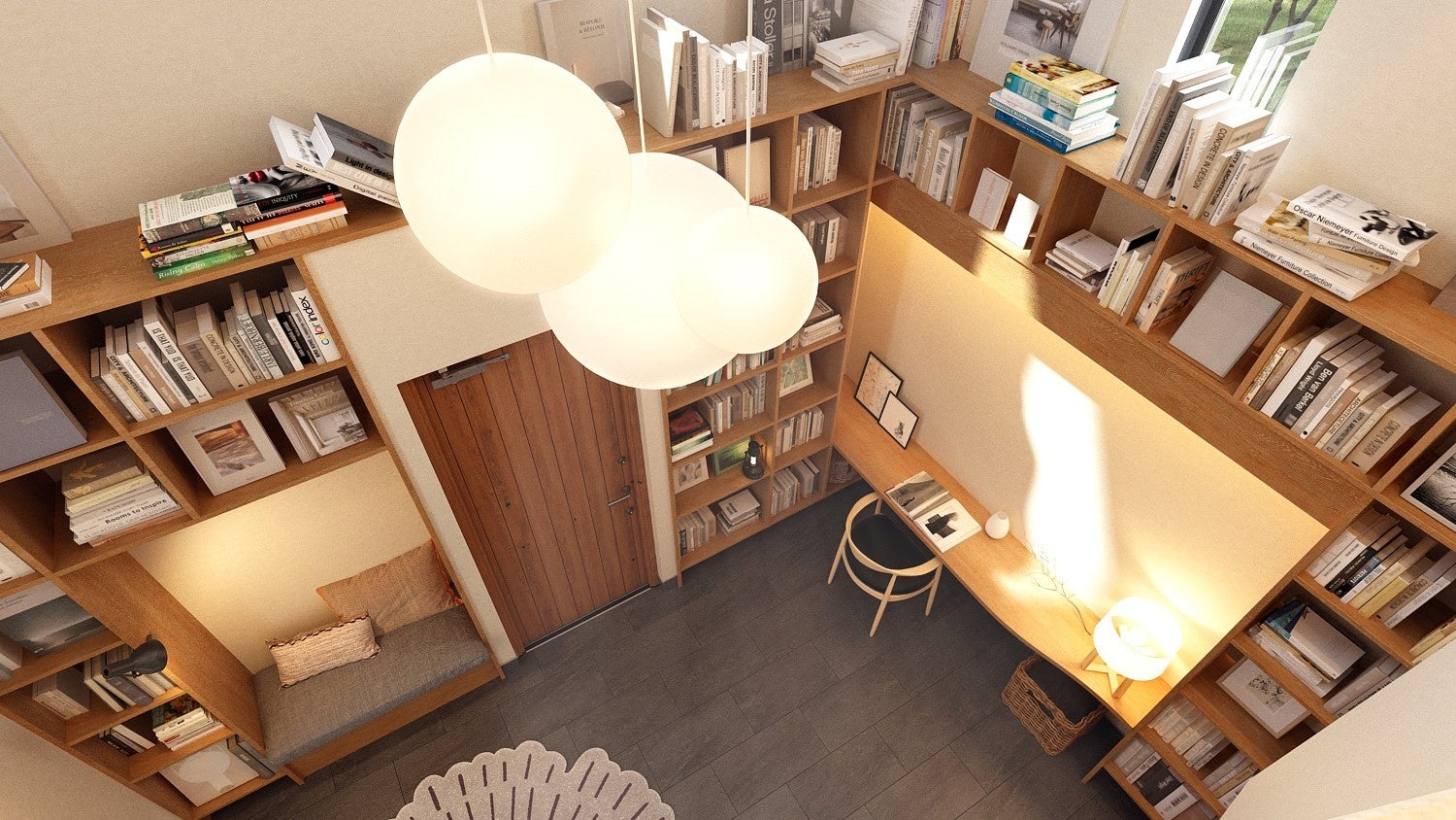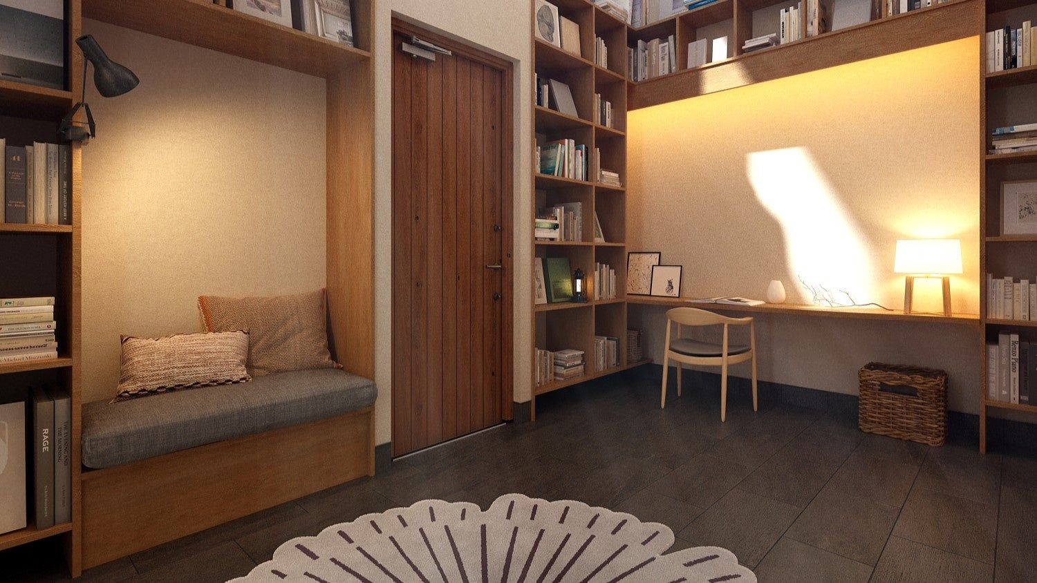1Fのエントランスに足を踏み入れると、心地よい自然光を取り入れた吹き抜けの開放的なオープンスペースが広がります。エントランスにはタイルを使用しており土足でも気軽に使用できます。また、作業カウンターを設けたり、壁一面を本棚にして好きな本や小物を置いたり、絵画などを飾ったりと自分の好きなものに囲まれて心置きなく過ごせる空間に。