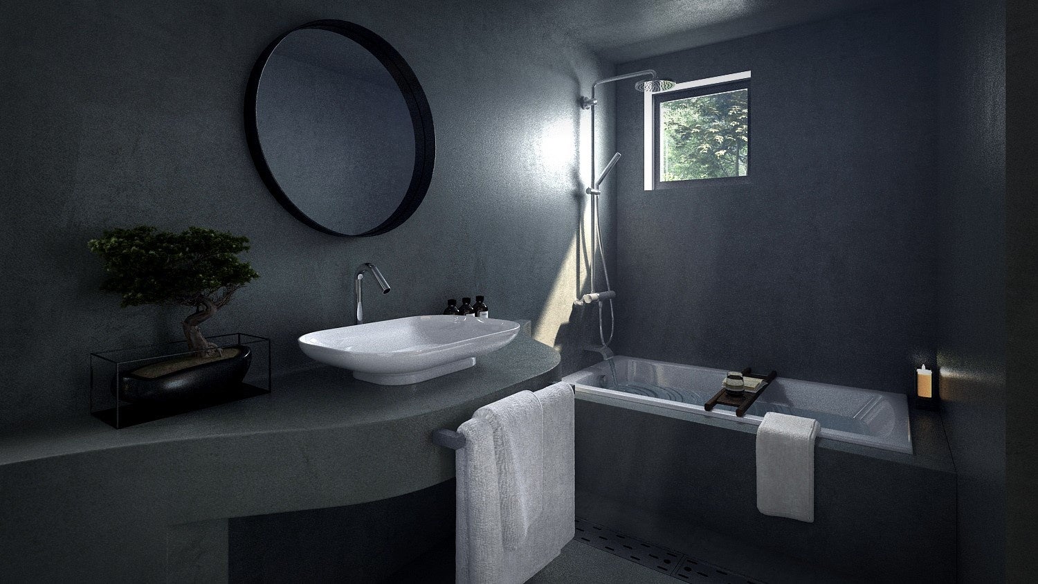 軽い運動の後やお休みの前には、のんびりと湯船につかり心身ともにリラックスできるように浴室の壁は落ち着くダークグレーを使用しています。