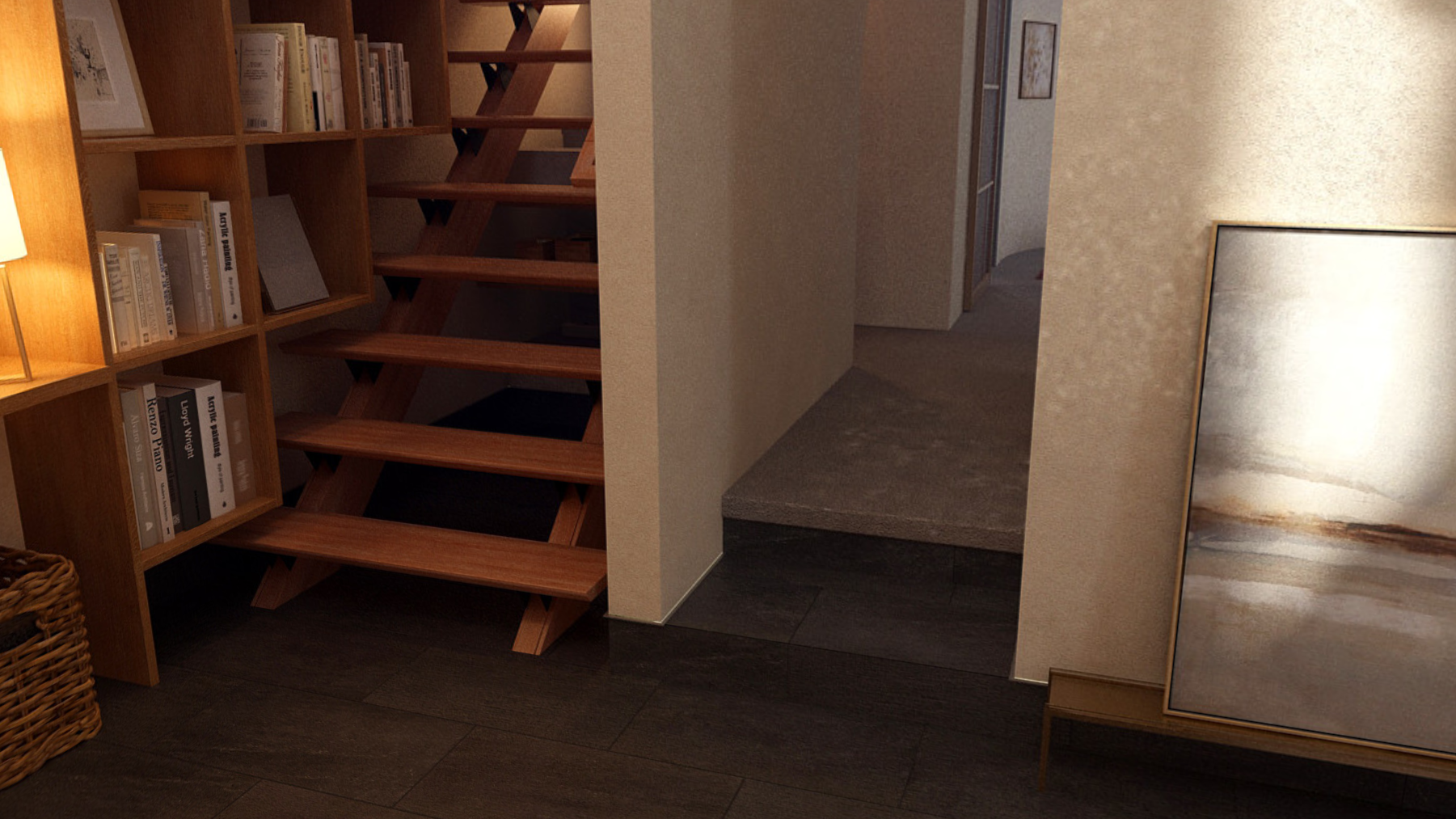 1Fは「カーペット」2Fは「木材」に分かれ素材の変化が空間の境目となるよう設計しています。