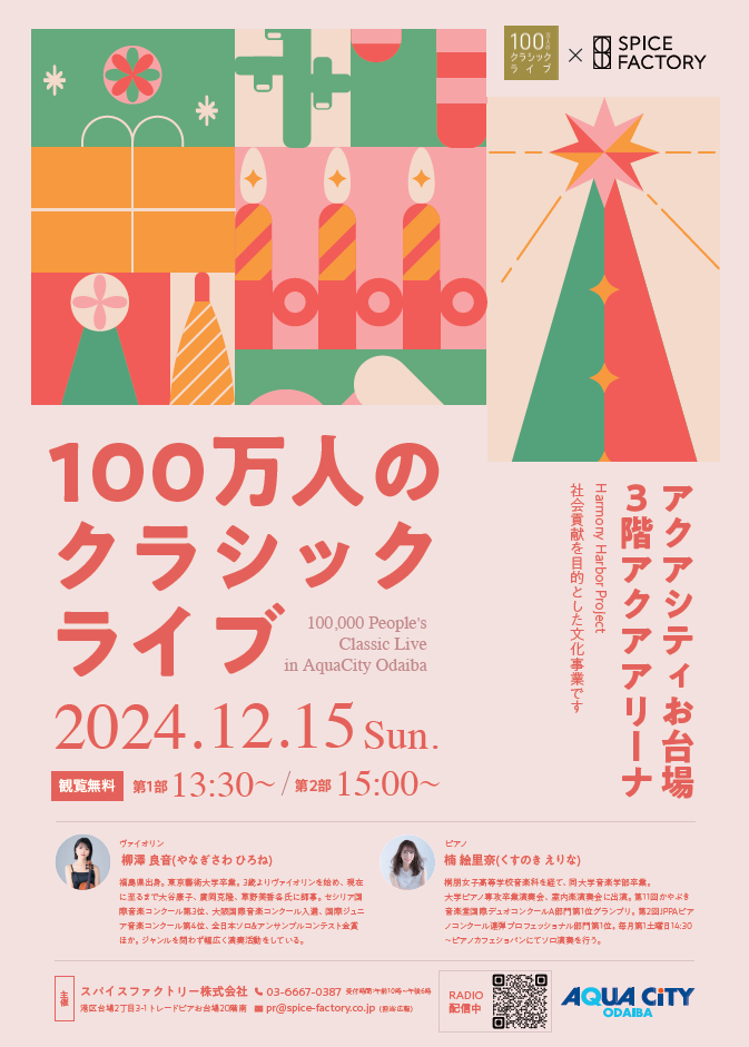 この度、スパイスファクトリー主催のもと、2024年12月15日(日)にアクアシティお台場にて100万人のクラシックライブを開催します。当社は、拠点を置く地域に対して積極的に貢献をすることを方針としています。当社が本社を置く、お台場エリアにおいて、音楽を通じて地域社会に貢献することを目的とし、本ライブを開催いたします。この取り組みを進めるにあたり、アクアシティお台場(運営:三菱地所プロパティマネジメント株式会社)様にご協力いただいております。