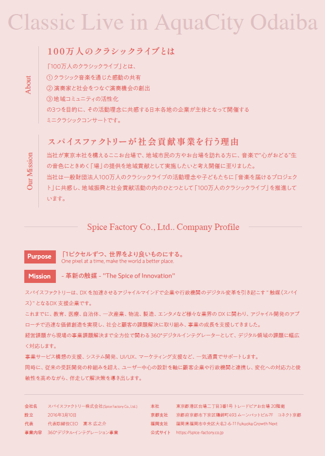 デジタル・トランスフォーメーションを⽀援するスパイスファクトリー株式会社(本社:東京都港区、代表取締役CEO:高木 広之介)は一般財団法人100万人のクラシックライブ(所在地:東京都千代田区、代表理事:蓑田 秀策)の活動理念に共感し、この活動を推進しております。
