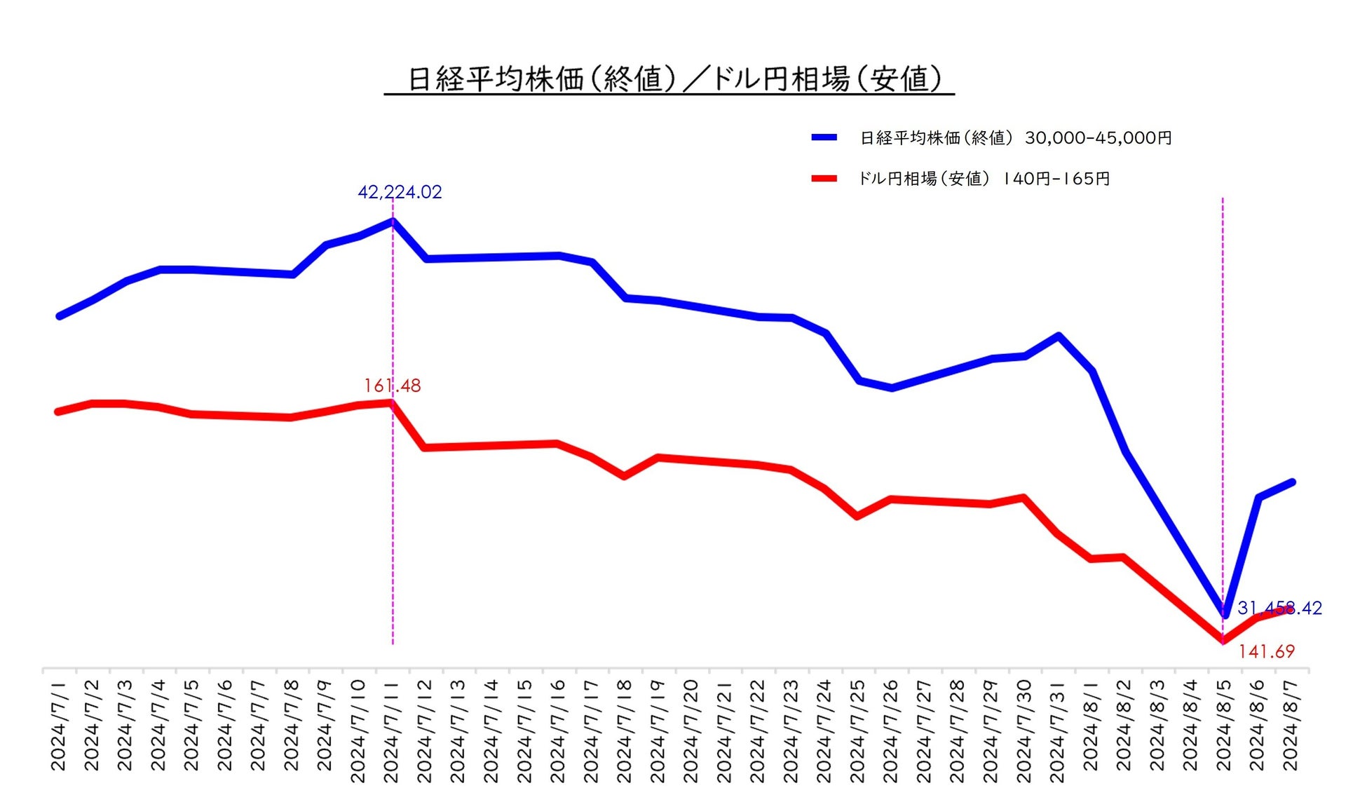 今回の円高は、日本政府による為替介入が疑われる動き(11日)や、日本銀行が金利を0.25%に引き上げると決めたこと(31日)に起因しています。そして、日経平均株価の値下がりは、米国株式市場のハイテク株の下落(17日)や、主要テクノロジー関連企業(特にTeslaとAlphabet)の決算結果の影響(24日)、アメリカ景気指標の悪化によってFRBの利下げ幅が大きくなり、円高が進むと予想(31日)されたこと等が原因とされており、アメリカ経済の影響は避けられません。