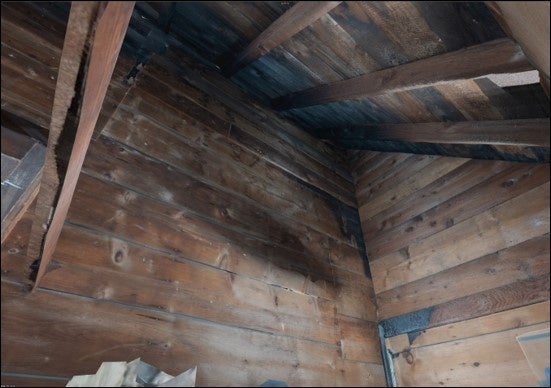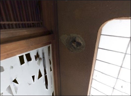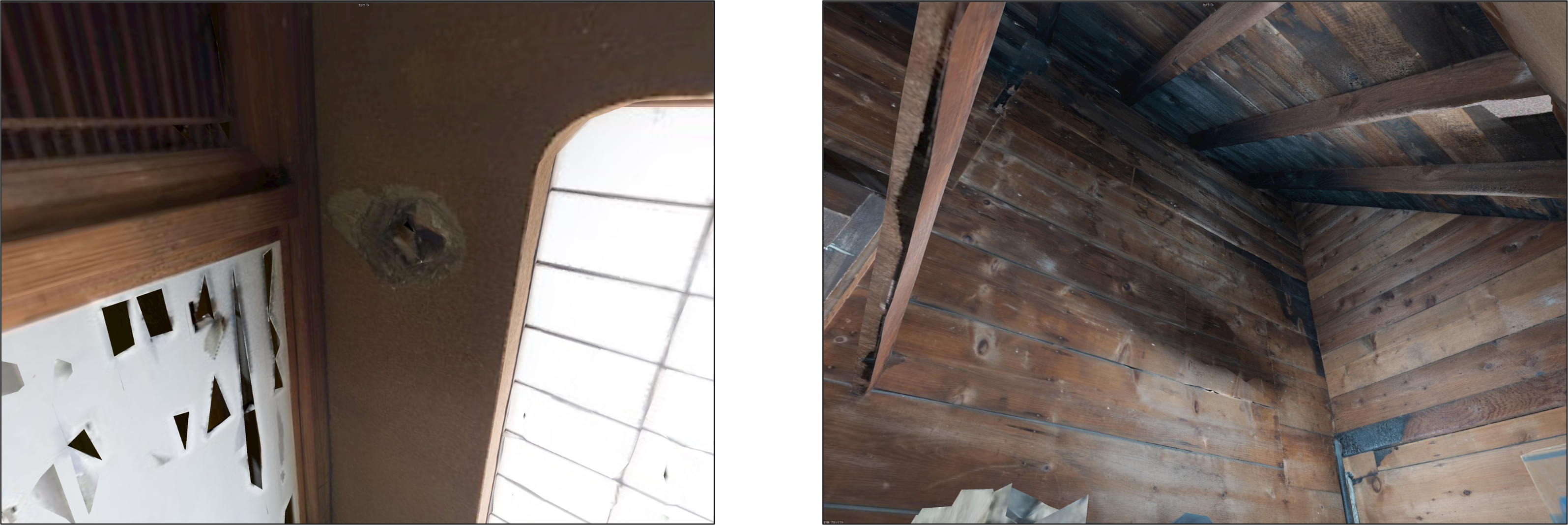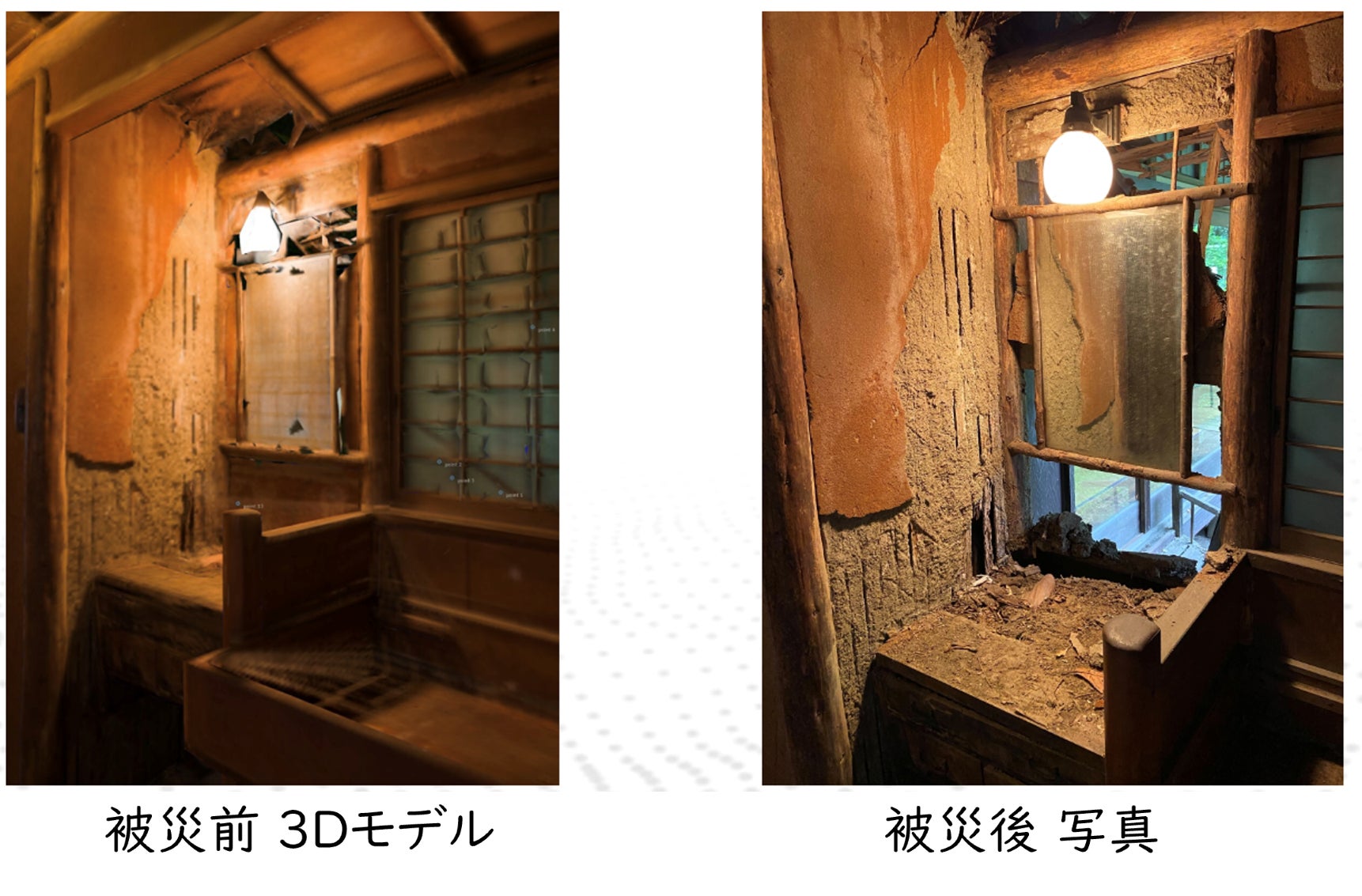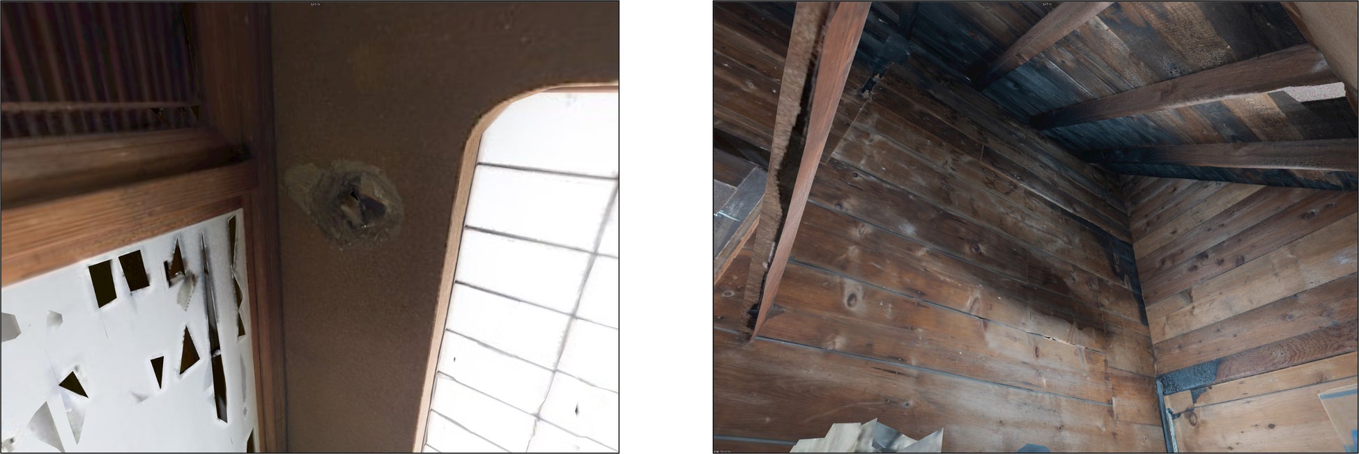 このような状況になる前に現状をそのままデジタルで残しておくことで歴史的な記録を現実に近い形で記録し「次の世代にその記録を継承できること」を価値提案としており、和館1階にある「機関銃貫通の跡」(下図左)や洋館2階「ボヤの跡」(下図右)もデータとして残りました。