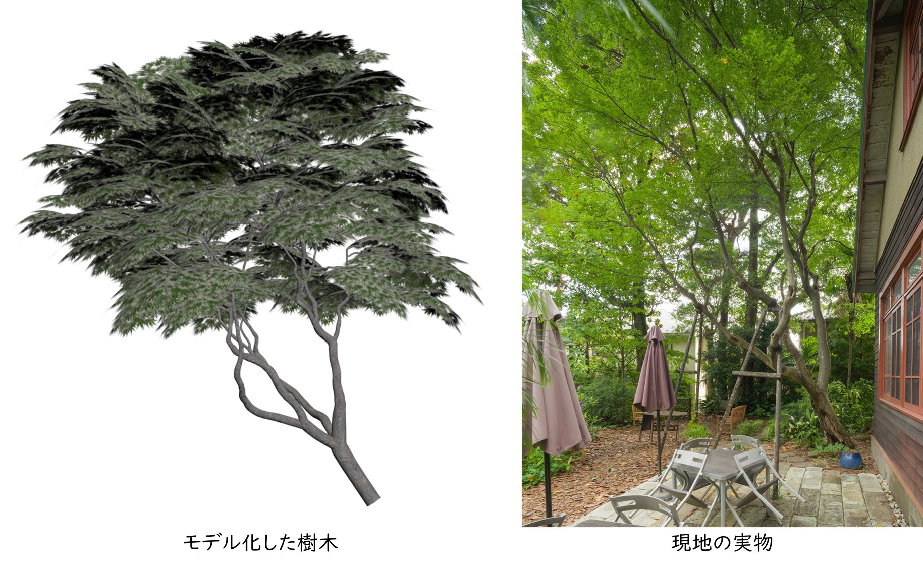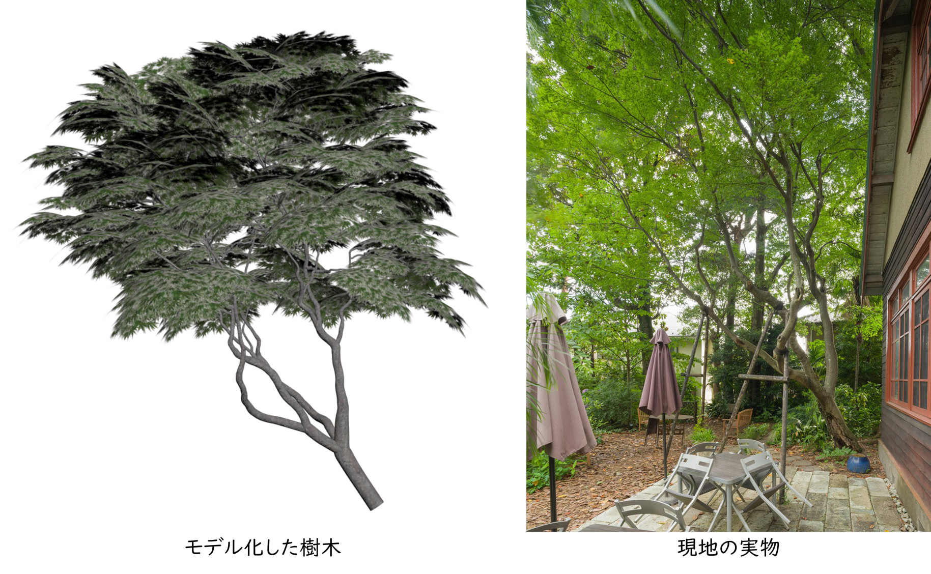 樹木の3Dスキャンデータから、写実的かつ生態的に正しい樹形表現の樹木モデルとして生成しています。