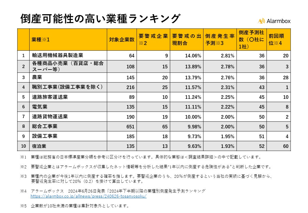 AI与信管理サービスを提供するアラームボックス株式会社(本社:東京都新宿区、代表取締役:武田浩和、以下「当社」)は、この度、2023年12月1日~2024年11月30日の期間に収集された13,697社・225,595件のネット情報等から1年以内に倒産する危険性がある“要警戒企業”を分析・抽出し、「倒産危険度の高い上位10業種」を予測しましたので発表します。