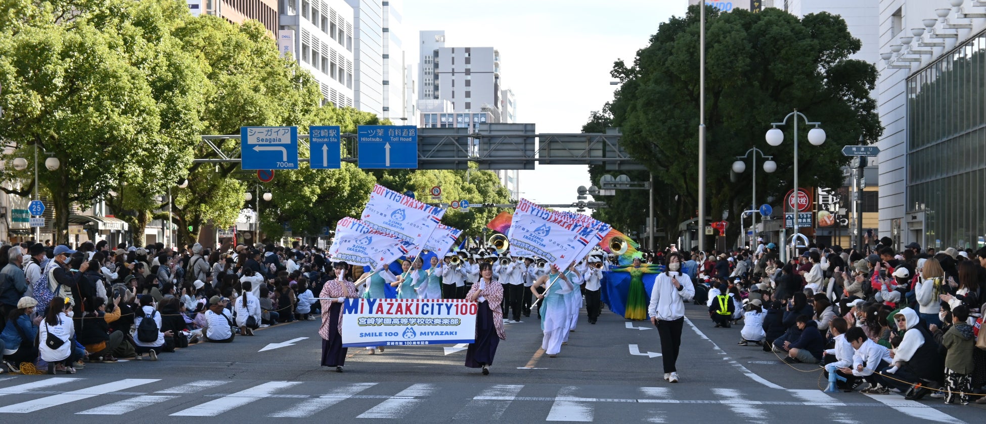 地元のキッズダンスチームも一緒に踊った東京ディズニーリゾート🄬スペシャルパレードをはじめ、宮崎学園高等学校吹奏楽部、市内6中学校の吹奏楽部チームによる圧巻のパフォーマンスに沿道に集まった約7万6千人の観衆が熱狂した他、年齢・性別・国籍等に関係なく市制100周年をお祝いしたいという市民等によるパレードも実施され、「多様性を認め、互いに支え合うみんなに開かれているまち」を象徴するものとなりました。