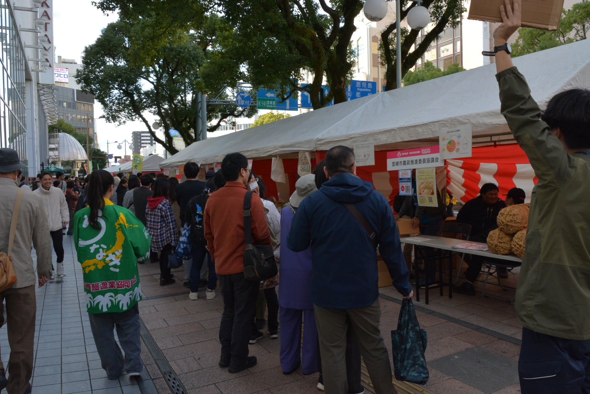 初日は宮崎駅前~宮崎山形屋までの高千穂通が歩行者天国に。「ミリョクの発信エリア」「ミンナでお祝いエリア」「ミライへの投資エリア」それぞれのステージには、食・芸能・音楽など多数の豪華ゲストが登壇。宮崎物産市場では、宮崎市の誇る豊かな自然が育んだ農畜水産物が並び、来場者は目当てのステージとグルメを堪能しました。